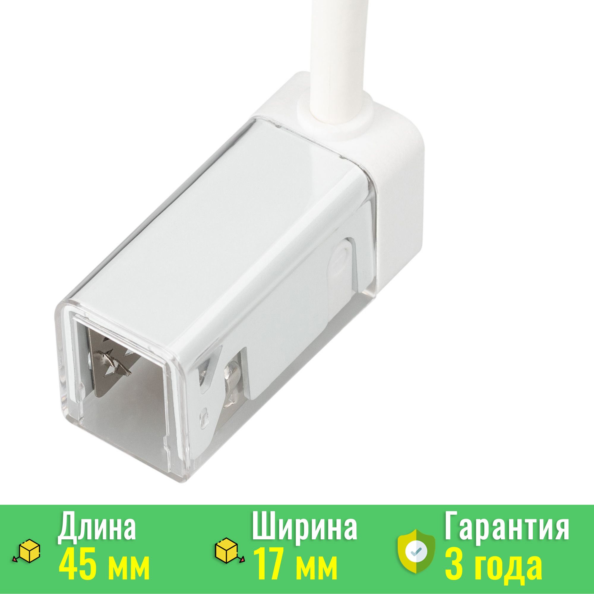 - Габариты: Компактные размеры 45x17x20 мм позволяют легко интегрировать коннектор в любую систему, не затрудняя монтаж и не нарушая внешний облик световой инсталляции.