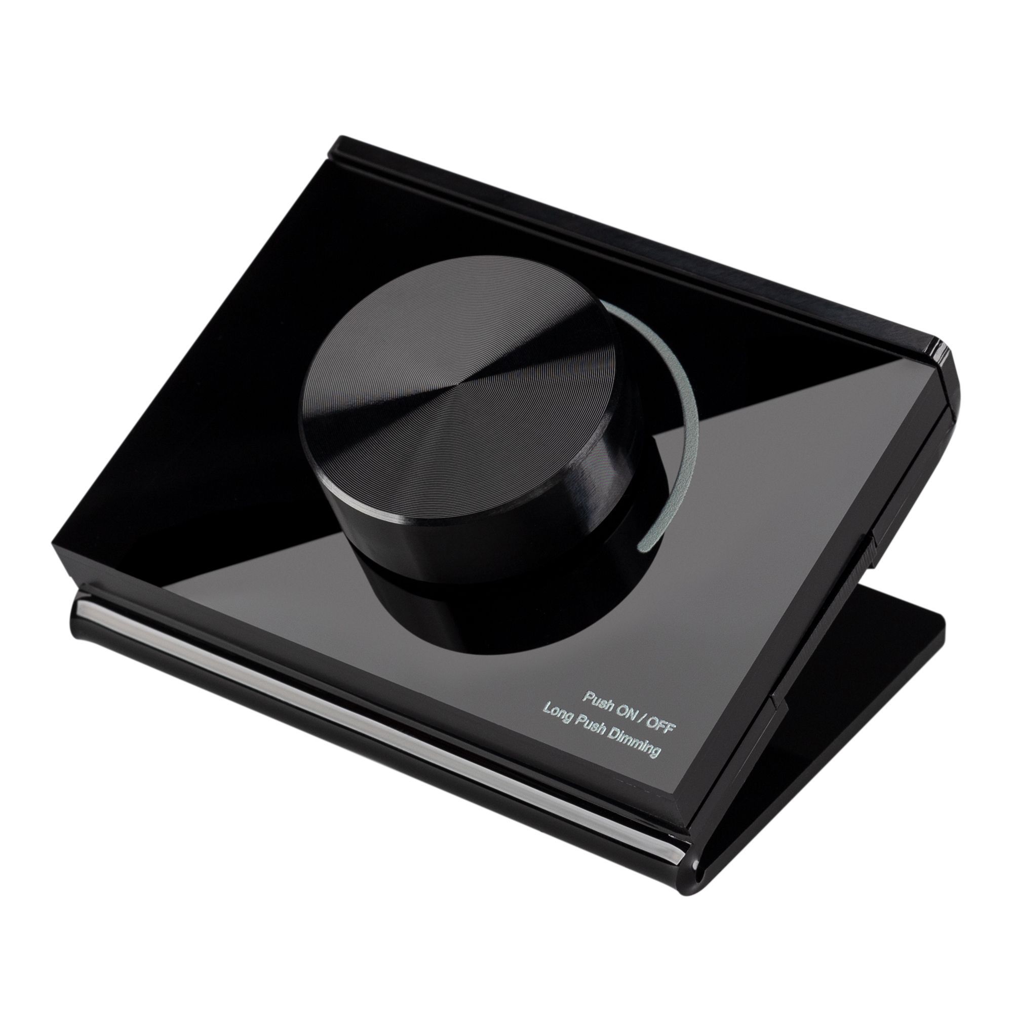 Панель оснащена удобным поворотно-нажимным регулятором, который позволяет легко и точно настроить яркость света. Основные функции включают включение и выключение света и регулировку яркости. Устройством можно управлять одноцветными светодиодными лентами и модулями при помощи радиочастотного сигнала (RF) на частоте 2.4 ГГц. Это означает, что вы можете управлять светом без необходимости направлять пульт прямо на панель.