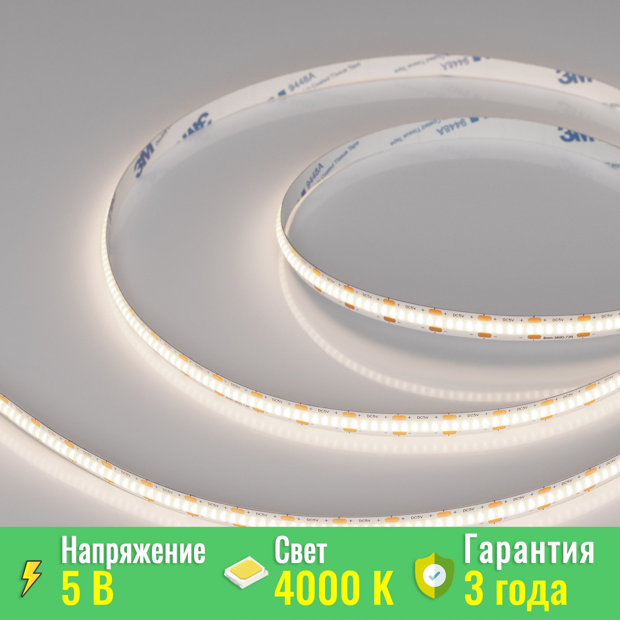 Светодиодная лента сплошного свечения COB серии X360. Светодиоды CSP, 360 шт/м, белая плата шириной 8 мм, скотч 3M. Цвет ДНЕВНОЙ 4000K, индекс цветопередачи CRI>90, угол 150°. Питание 5 В, мощность 5 Вт/м (25 Вт на 5 м). Размеры 5000х8х1.8 мм. Мин. отрезок 13.9 мм. Цена за 1 м. Рекомендуется установка на алюминиевый профиль. Заказать товар 039737 вы можете в Санкт-Петербурге по телефону 8 (800) 700-80-91.