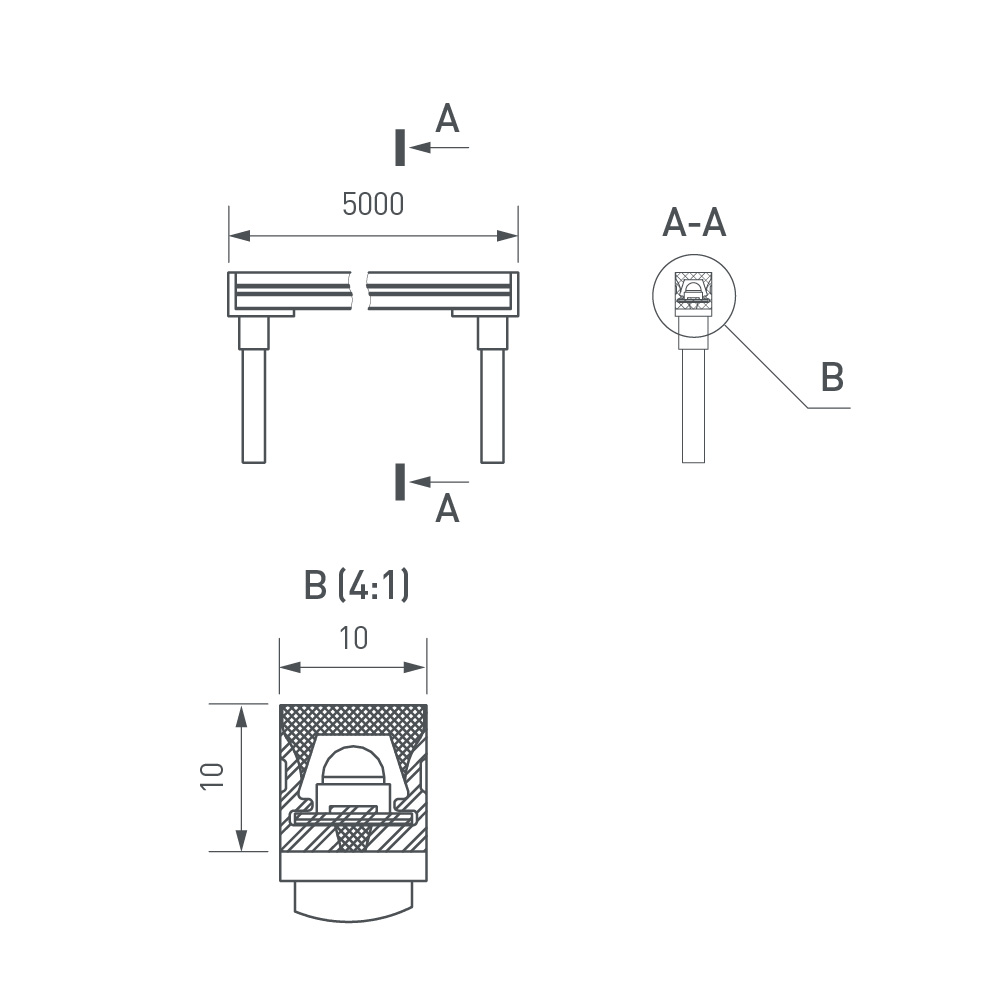 Эта светодиодная лента имеет квадратное сечение размером 10×10 мм, что делает её компактной и легко монтируемой на различные поверхности. Материал корпуса выполнен из силикона, обеспечивающего гибкость и долговечность изделия.