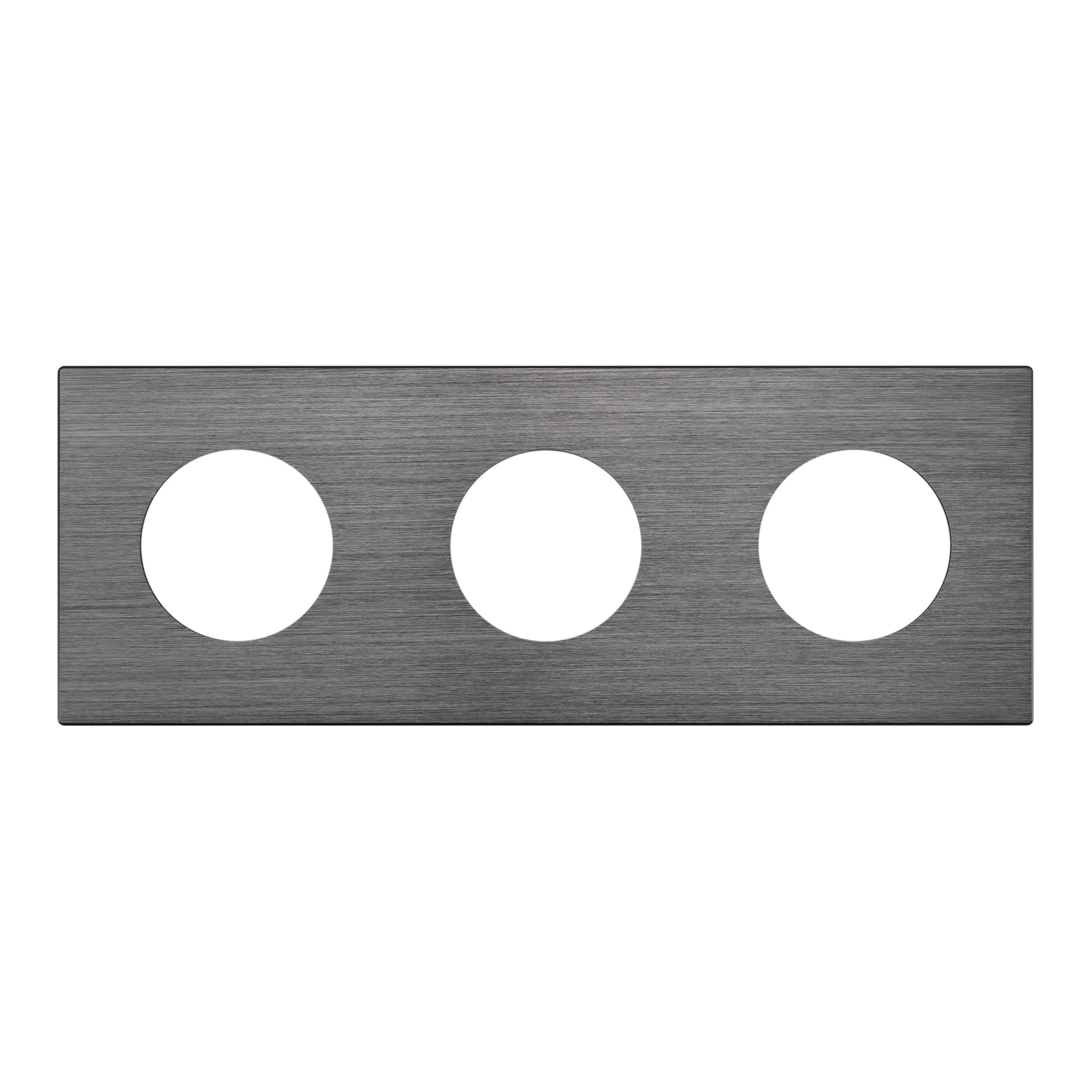 Рамка на 3 поста изготовлена из прочного алюминиевого сплава, что гарантирует долговечность эксплуатации и устойчивость к механическим воздействиям. Лицевая поверхность имеет сатинированную обработку (шлифованную текстуру), которая придает изделию благородный матовый блеск и делает его устойчивым к появлению отпечатков пальцев и мелких царапин.