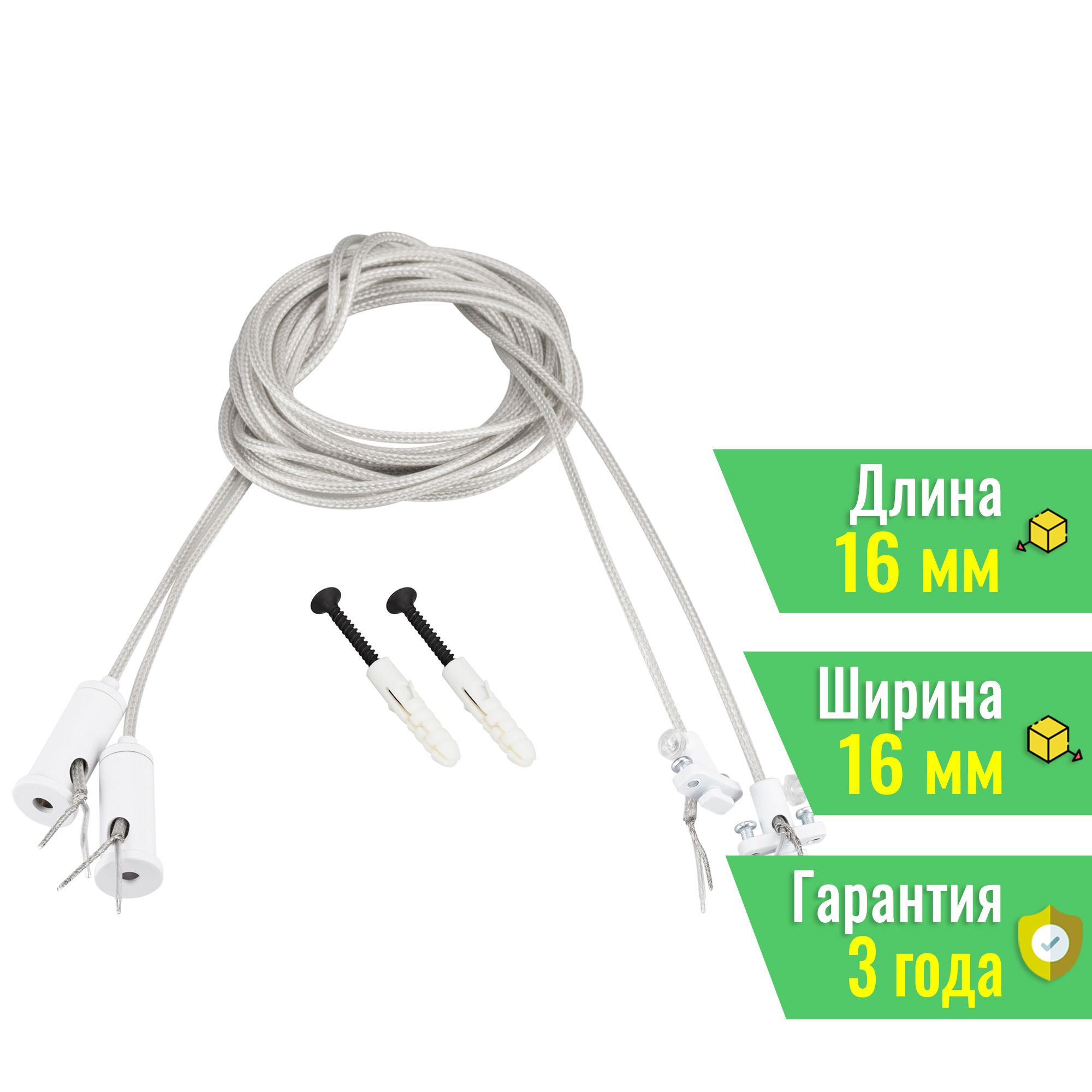 Максимальная нагрузка на один трос достигает 4 кг, что гарантирует устойчивость и долговечность конструкции. При этом допустимое напряжение нагрузки составляет до 250 В, а максимальный ток – 2 А, что делает этот комплект идеальным выбором для большинства светодиодных решений.