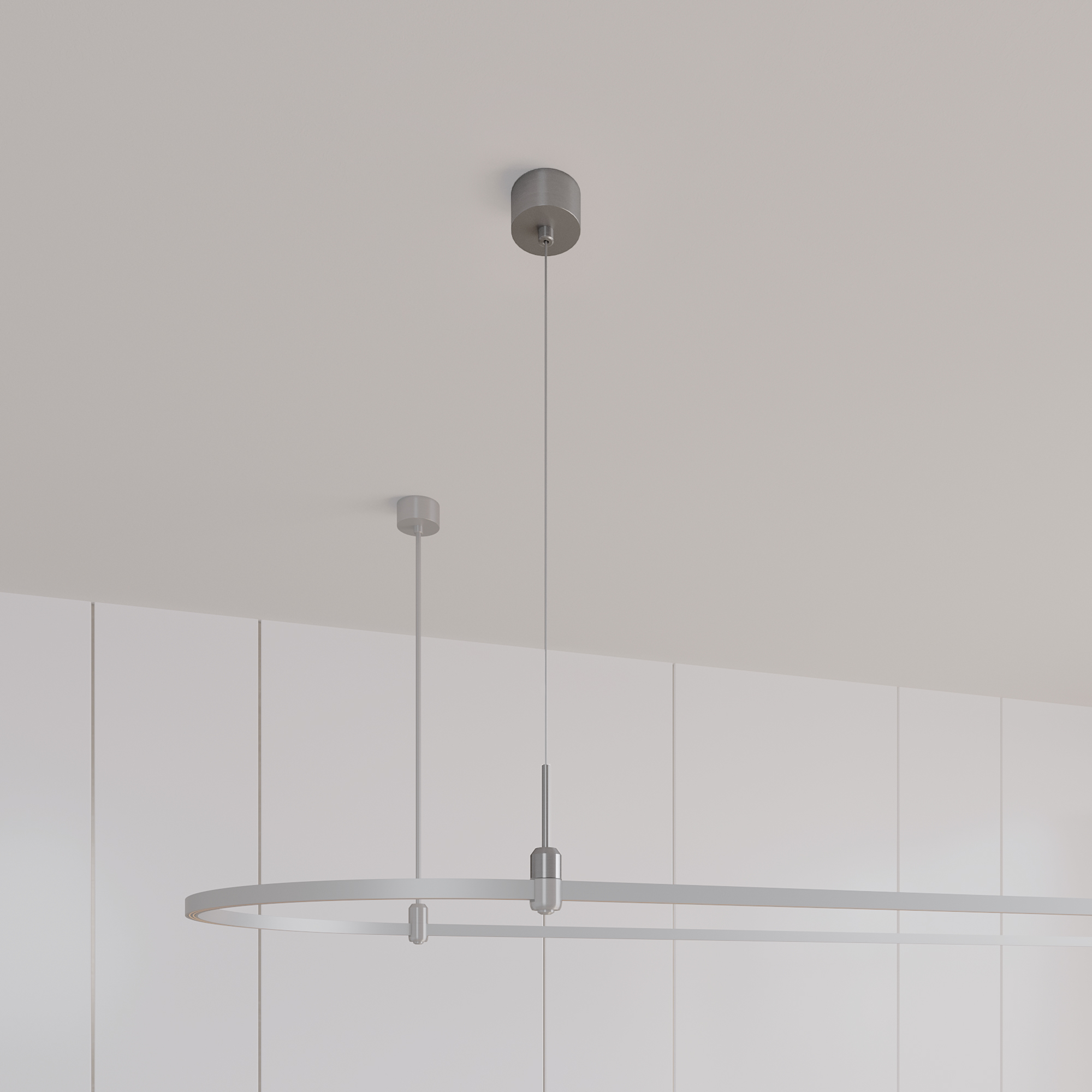 Корпус подвеса изготовлен из высококачественного алюминия, который известен своей прочностью и легкостью. Материал покрыт гальваническим слоем в цвете "титан", что придает изделию современный внешний вид и дополнительно защищает его от коррозии и механических повреждений. Диаметр подвеса составляет 80 мм, а его длина достигает 5000 мм, что делает его универсальным решением для различных интерьеров и дизайнерских проектов.