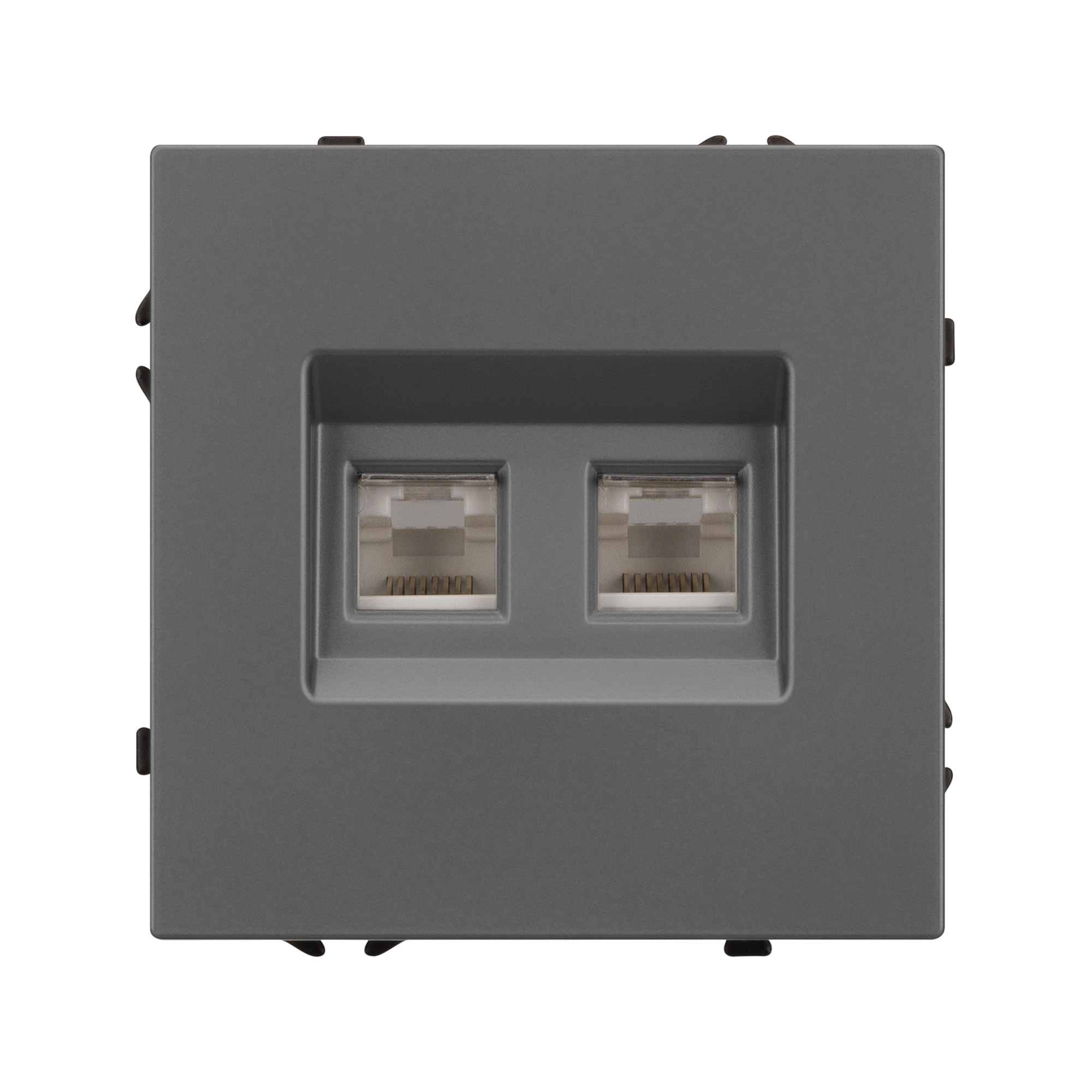 Механизм компьютерной розетки на 2 поста 6-й категории. Цвет - серый, с Soft-Touch покрытием. Без фронтальной рамки. Уровень пылевлагозащиты IP20. Тип подключаемого разъема - RJ45. Розетка устанавливается в стандартный подрозетник круглого сечения диаметром 60мм.