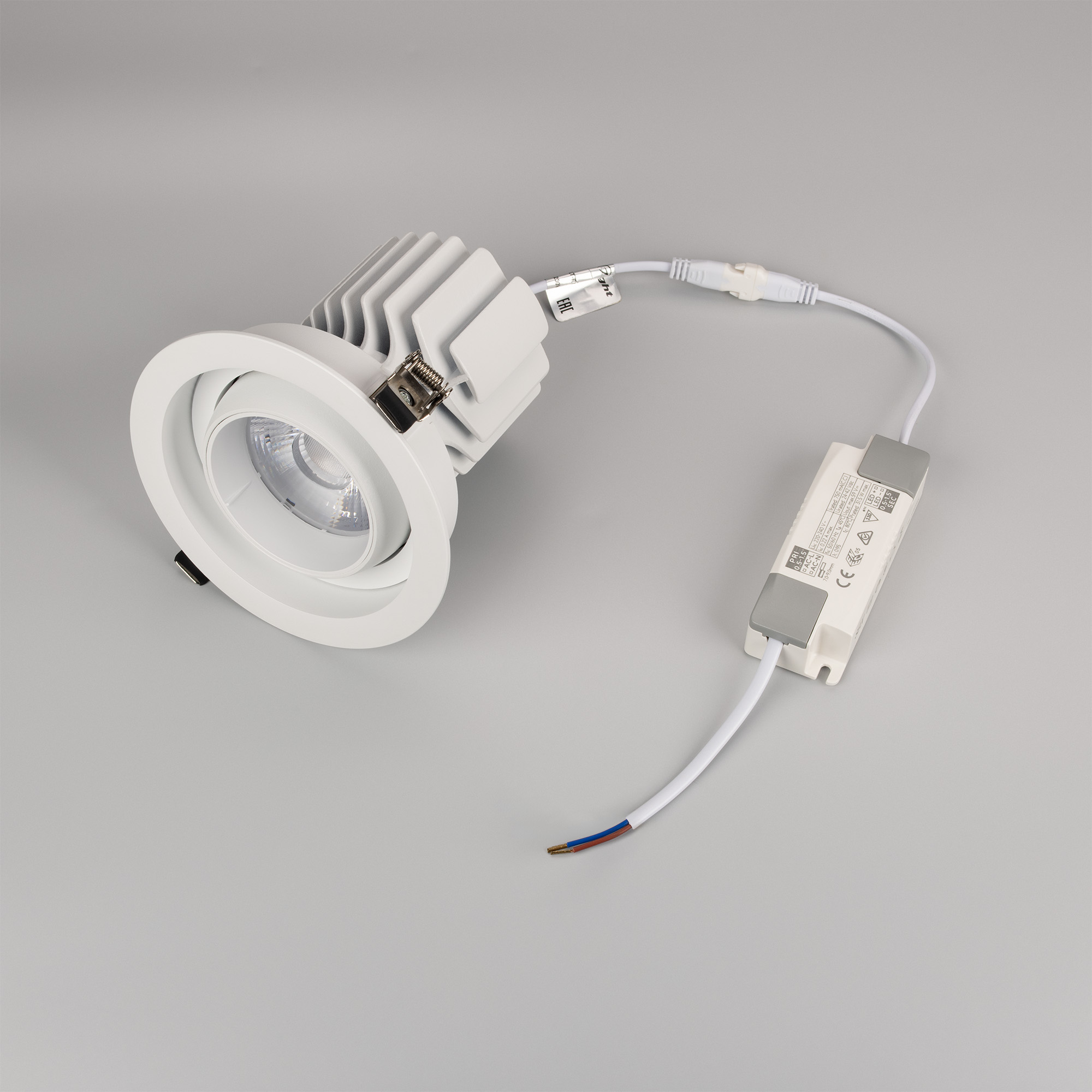 Встраиваемый карданный светильник. Мощность 30 Вт, св. поток 3104 лм, 102лм/Вт, тёплый 3000 K, CRI>92, угол 17°, напряжение питания 230 В. Белый корпус из алюминия, белая вставка, степень защиты IP20. Размер: диаметр 135 мм, высота 125 мм. Монтаж встраиваемый, установочное отверстие: диаметр 120 мм. Драйвер 24-42 В, 750 мА, пульсация <2%. Заказать товар 056568 вы можете в Санкт-Петербурге по телефону 8 (800) 700-80-91.