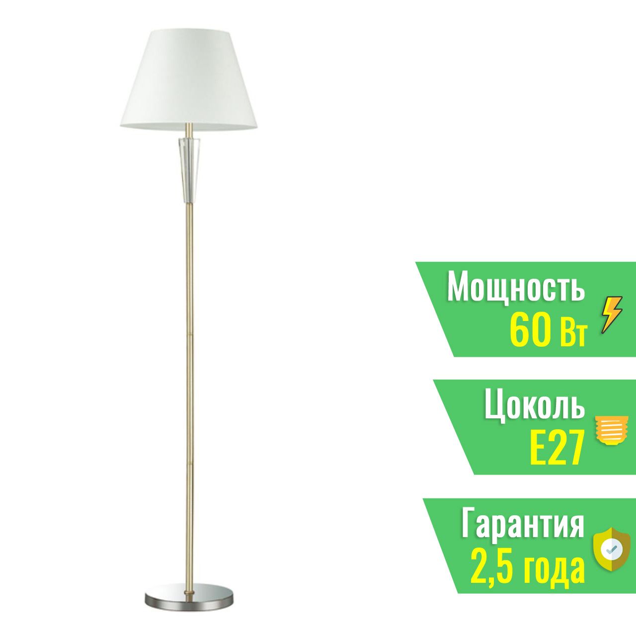 Торшер выполнен в классическом стиле, что делает его идеальным выбором для интерьеров с нотками неоклассики. Особенность данной модели — эффектное сочетание хромированных и золотистых элементов в основании, что придает светильнику благородный и изысканный вид. Белоснежный текстильный абажур мягко рассеивает свет, а декоративные стеклянные подставки необычной формы становятся ярким акцентом всей композиции.