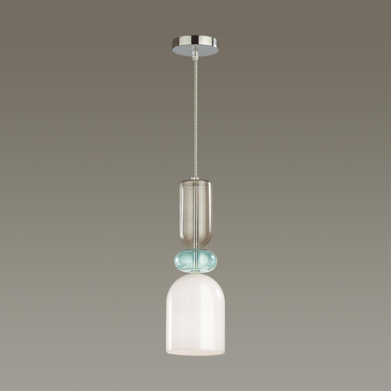 Светильник выполнен в стиле модерн, который идеально вписывается в современные интерьерные решения. Хромированная арматура с глянцевой поверхностью красиво отражает свет, создавая дополнительные световые блики в помещении. Особую изюминку модели придает декоративный элемент из цветного стекла серо-голубых оттенков, который гармонично сочетается с белым глянцевым плафоном.