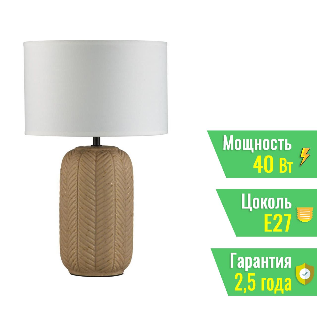 Основание светильника выполнено из высококачественной керамики бежевого оттенка, напоминающего древесную текстуру. Матовая поверхность арматуры придаёт изделию благородный вид и подчеркивает натуральность материала. Над основанием возвышается белый текстильный абажур цилиндрической формы, который мягко рассеивает свет, создавая комфортное освещение.