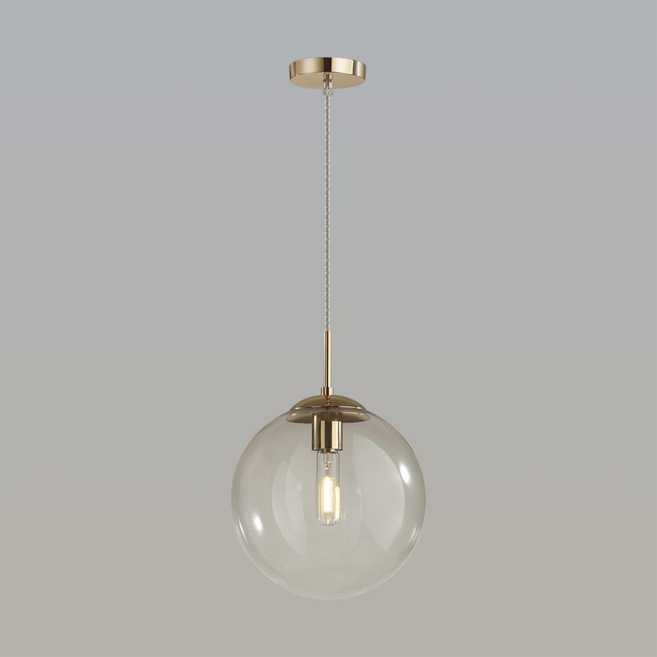Светильник выполнен в форме стеклянного прозрачного шара диаметром 250 мм, что делает его универсальным элементом для различных интерьерных решений. Глянцевая золотая арматура из качественного металла придает изделию роскошный вид и становится акцентной деталью в помещении. Прозрачный плафон из стекла создает красивую игру света, наполняя пространство мягким сиянием.