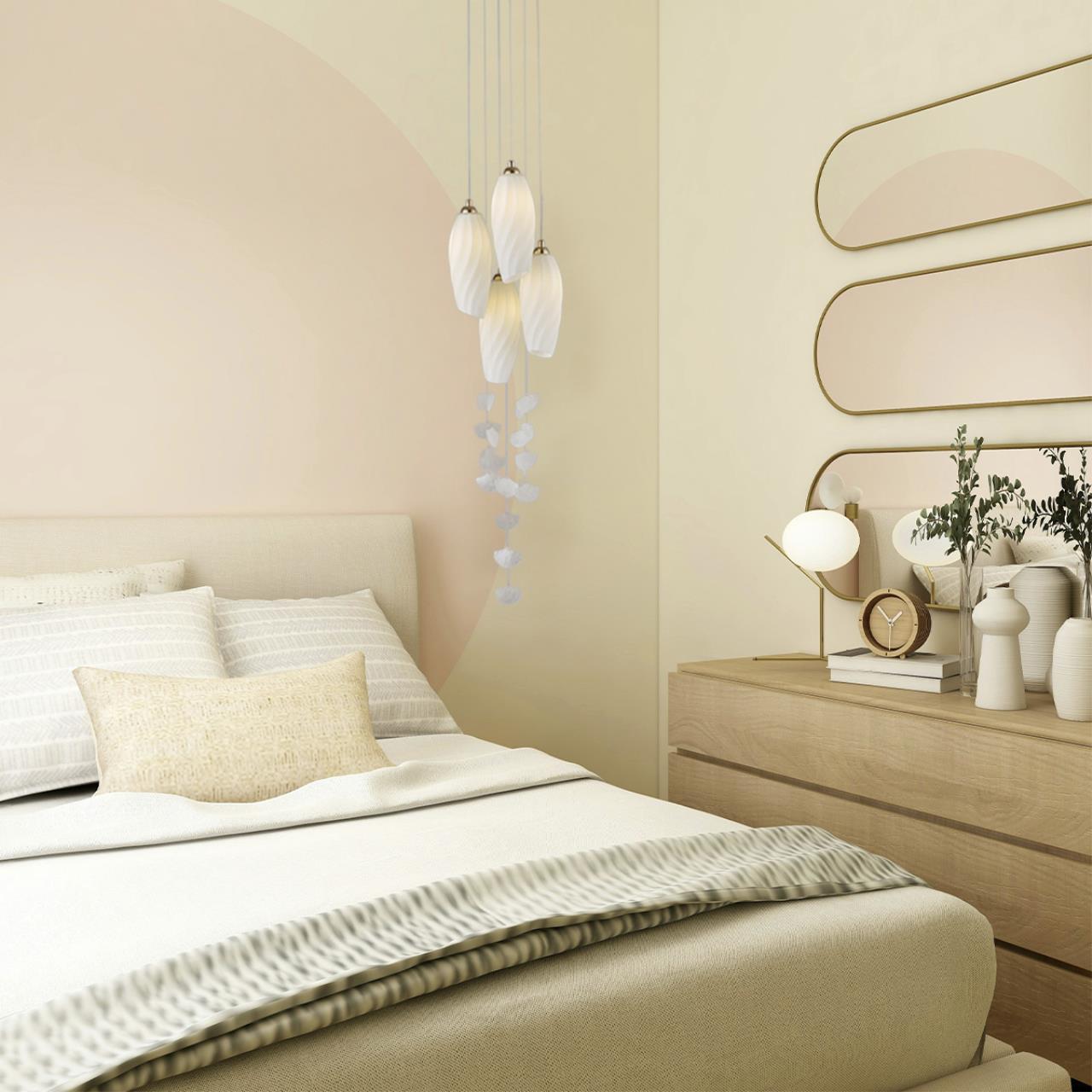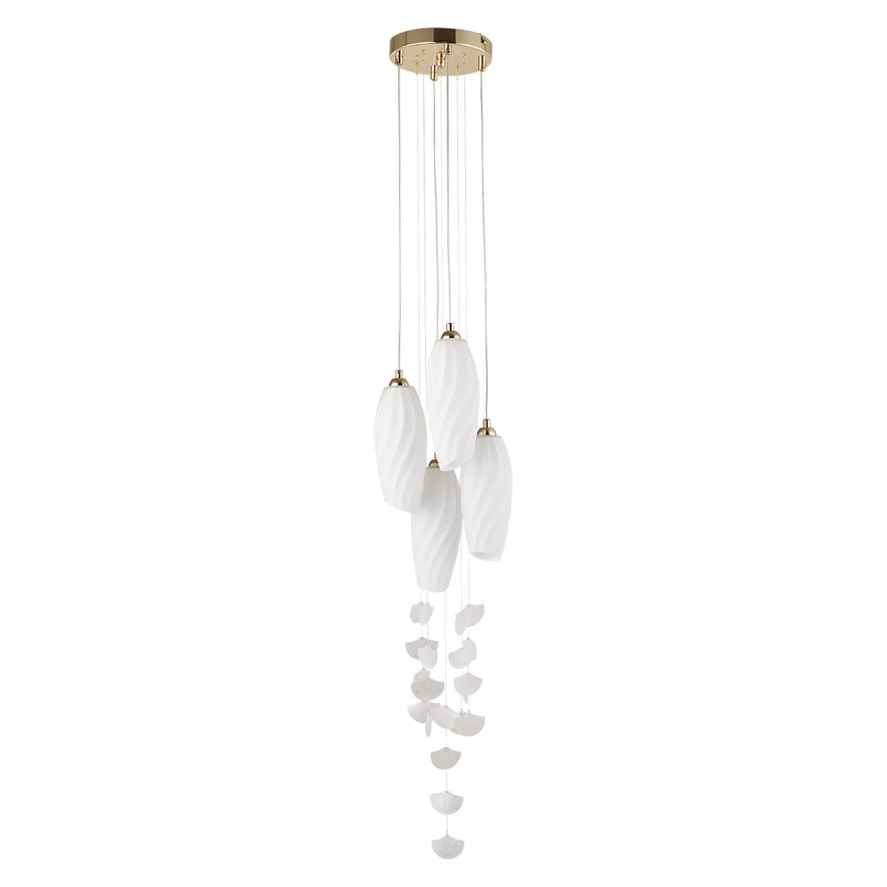 Особую выразительность модели придают плафоны из фактурного стекла, выполненные в виде цветочных бутонов. Каждый из четырех плафонов имеет матовую поверхность белого цвета, что создает мягкое и приятное освещение. Декоративные элементы в виде ракушек из тонкого стекла добавляют светильнику уникальности и шарма.