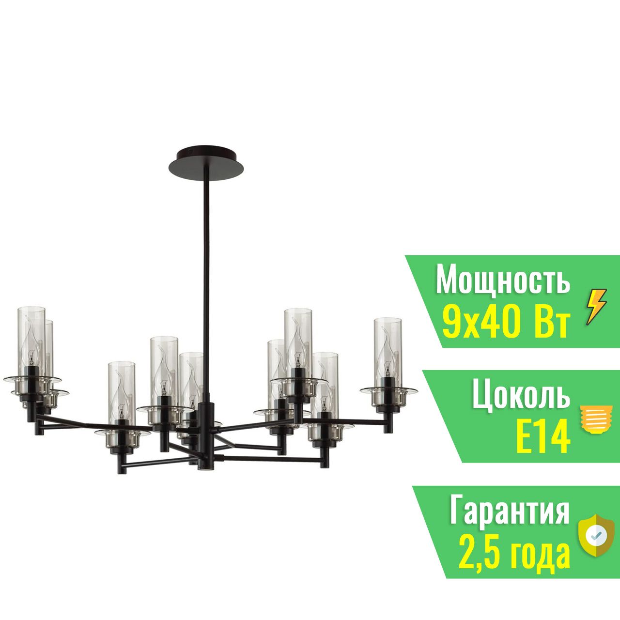 Люстра представляет собой гармоничную композицию из металлической арматуры матового черного цвета и 9 стеклянных плафонов дымчатого оттенка с глянцевой поверхностью. Строгие цилиндрические плафоны подчеркивают классический стиль светильника, придавая ему аристократический вид. Общий диаметр люстры составляет 820 мм, что делает ее заметным акцентом в пространстве помещения.
