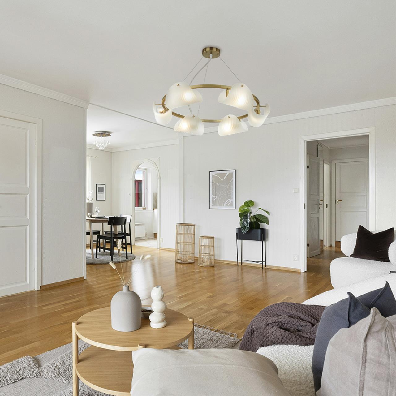 Люстра выполнена в круговой форме с диаметром 700 мм и высотой 1240 мм, что создаёт величественное присутствие в пространстве. Металлический каркас благородного медного цвета с глянцевой поверхностью прекрасно гармонирует с изогнутыми плафонами из матового белого стекла, придавая светильнику воздушность и лёгкость.