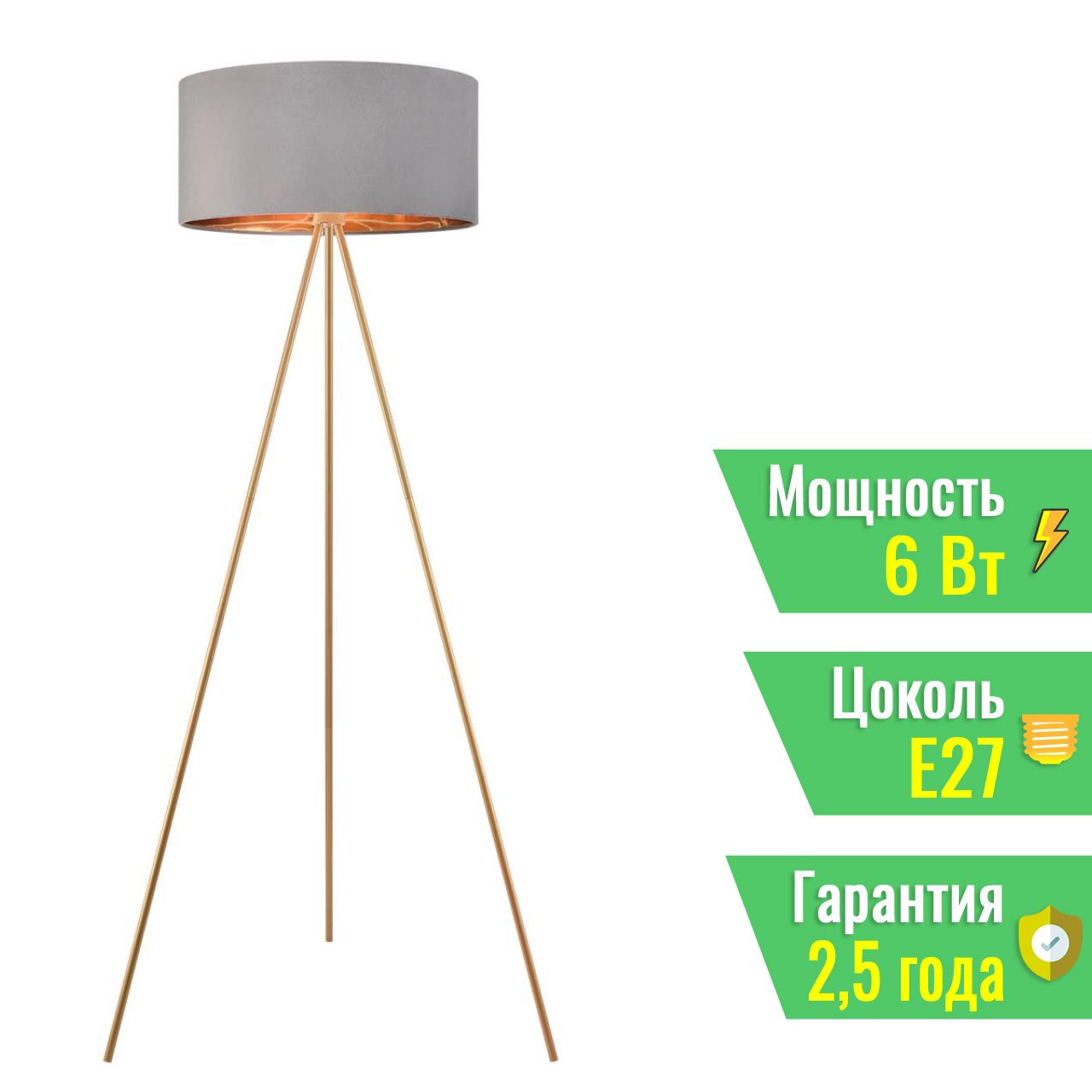 Торшер выполнен в классическом стиле с элементами неоклассики, что делает его универсальным решением для различных интерьерных концепций. Золотистая арматура гармонично сочетается с серым бархатным абажуром, который имеет золотую внутреннюю поверхность для создания мягкого, теплого освещения.