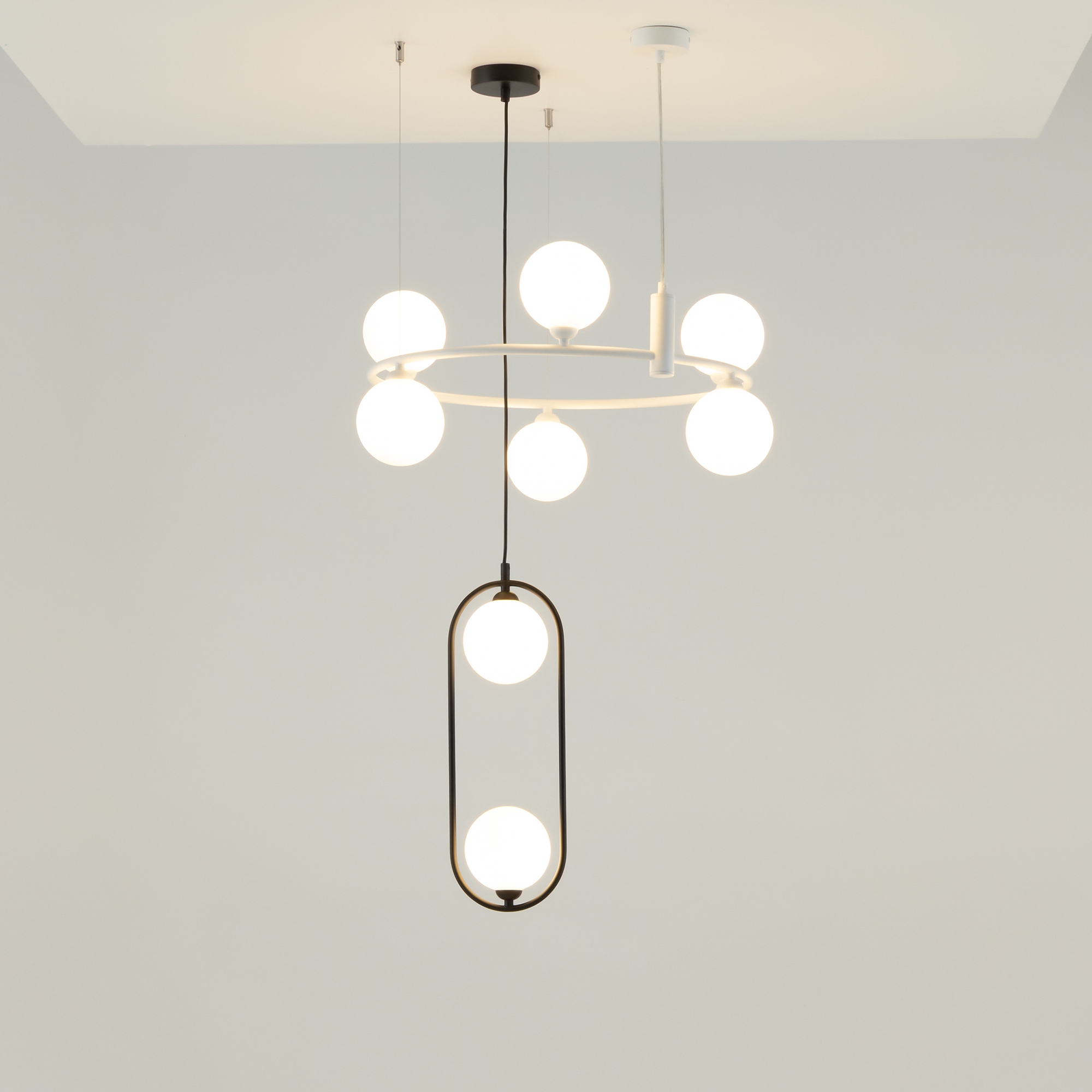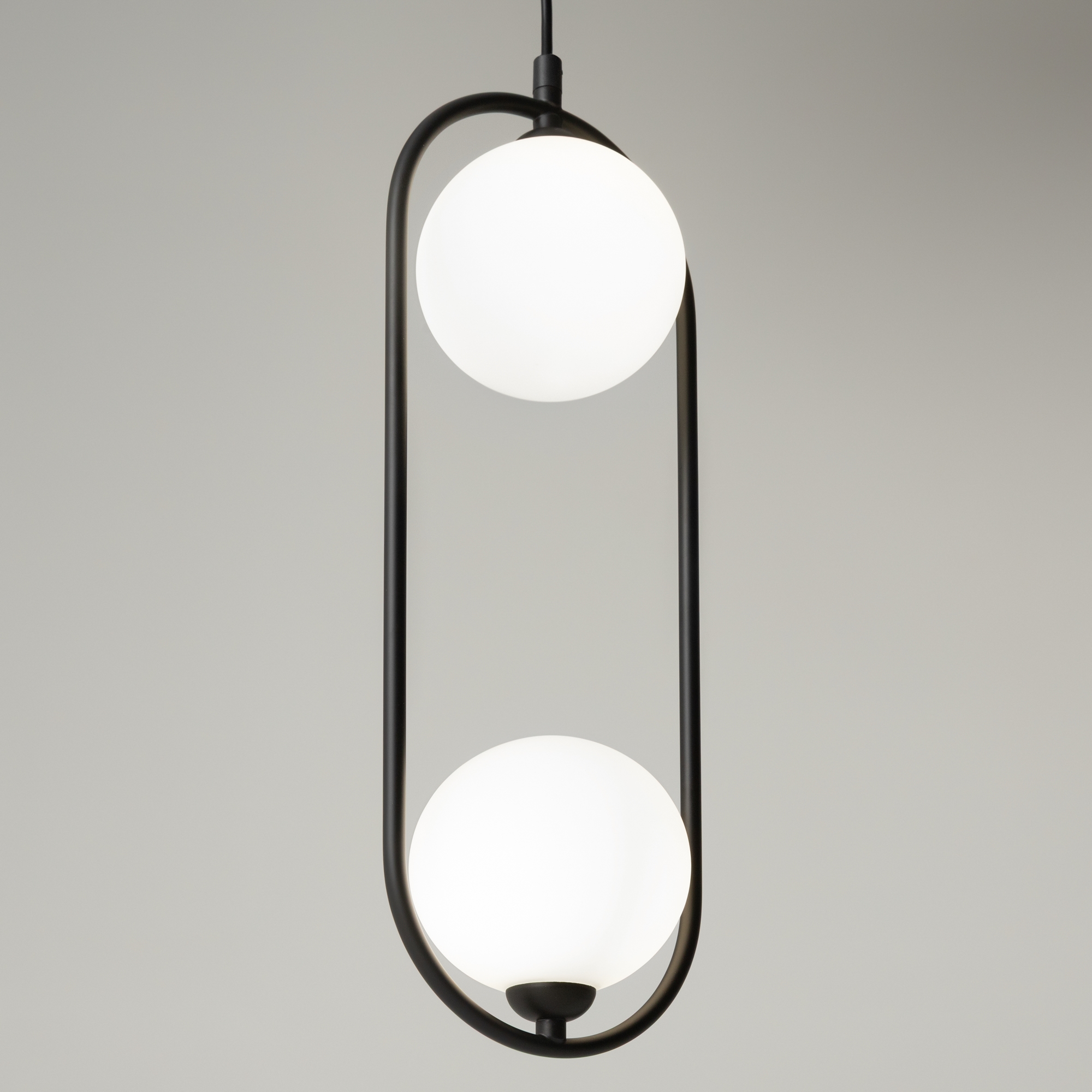 Светильник выполнен в современном стиле и представляет собой композицию из двух сферических плафонов из белого выдувного стекла, которые элегантно закреплены на округлом металлическом каркасе черного цвета. Такое сочетание материалов и форм создает изысканный образ, который гармонично вписывается в различные интерьерные решения.