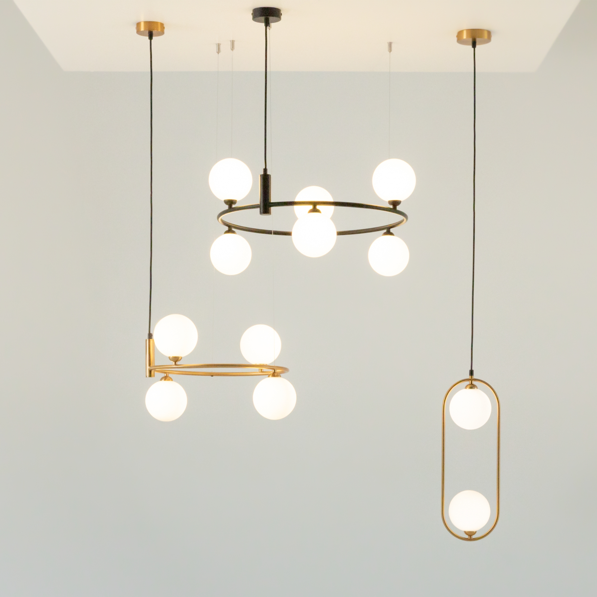 Светильник представляет собой оригинальную композицию, где четыре сферических плафона из белого выдувного стекла закреплены на округлом металлическом каркасе, выполненном в цвете латунь. Такое решение обеспечивает не только эстетическую привлекательность, но и равномерное распределение света в помещении.