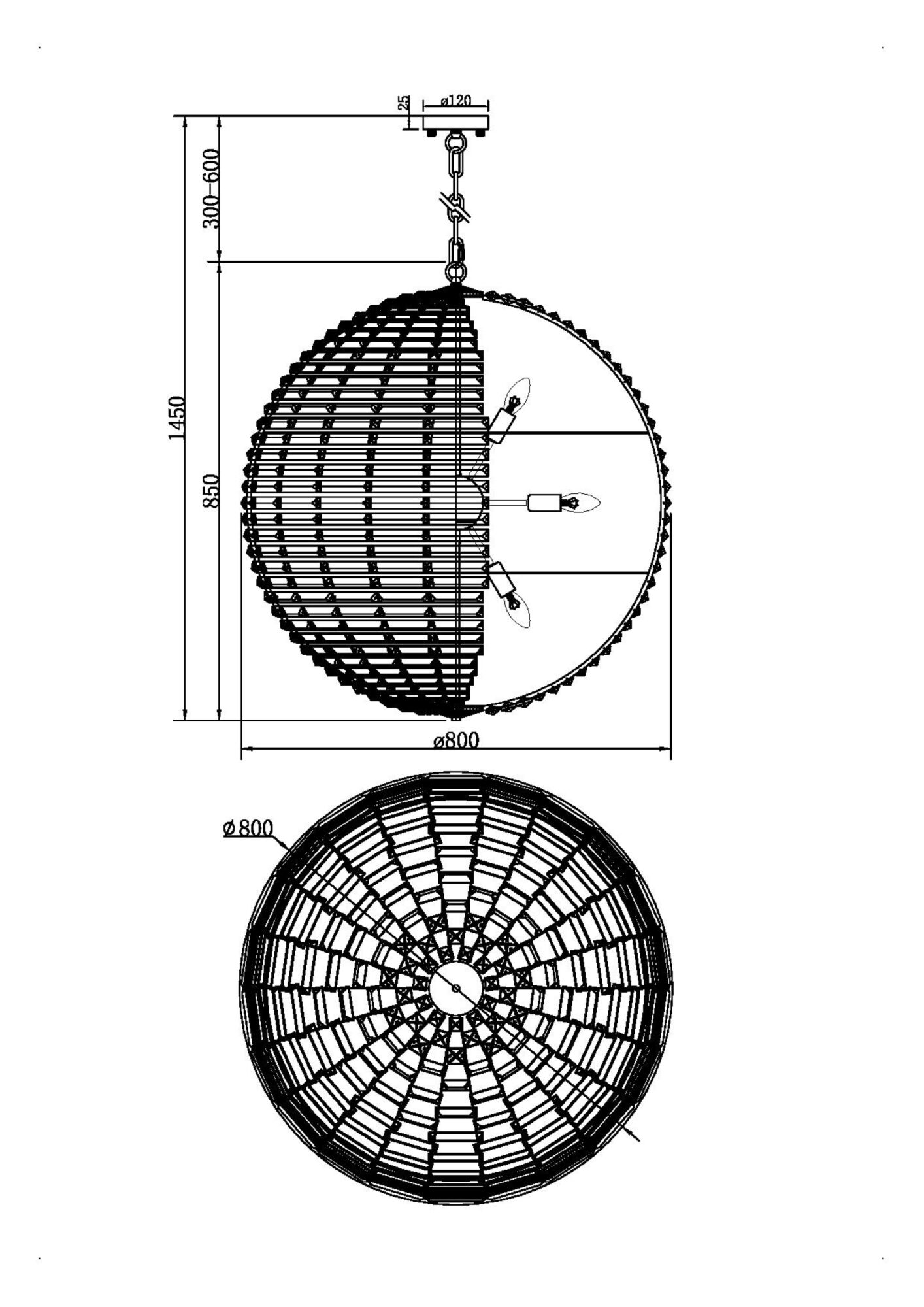 Общая высота светильника составляет 1450 мм, при этом минимальная высота может быть уменьшена до 1050 мм. Регулировка высоты осуществляется с помощью цепи длиной 600 мм, что позволяет адаптировать светильник под особенности помещения и пожелания владельца.