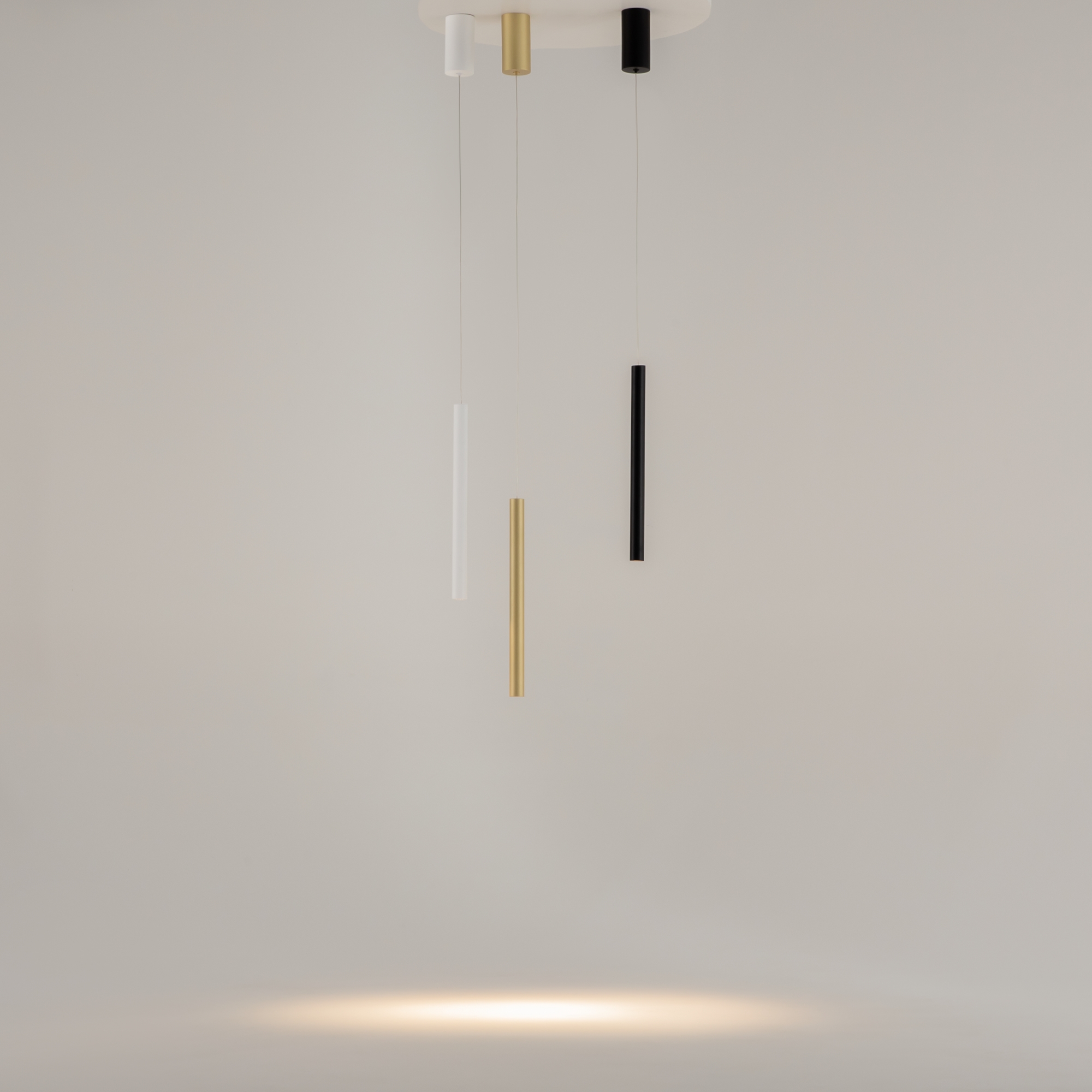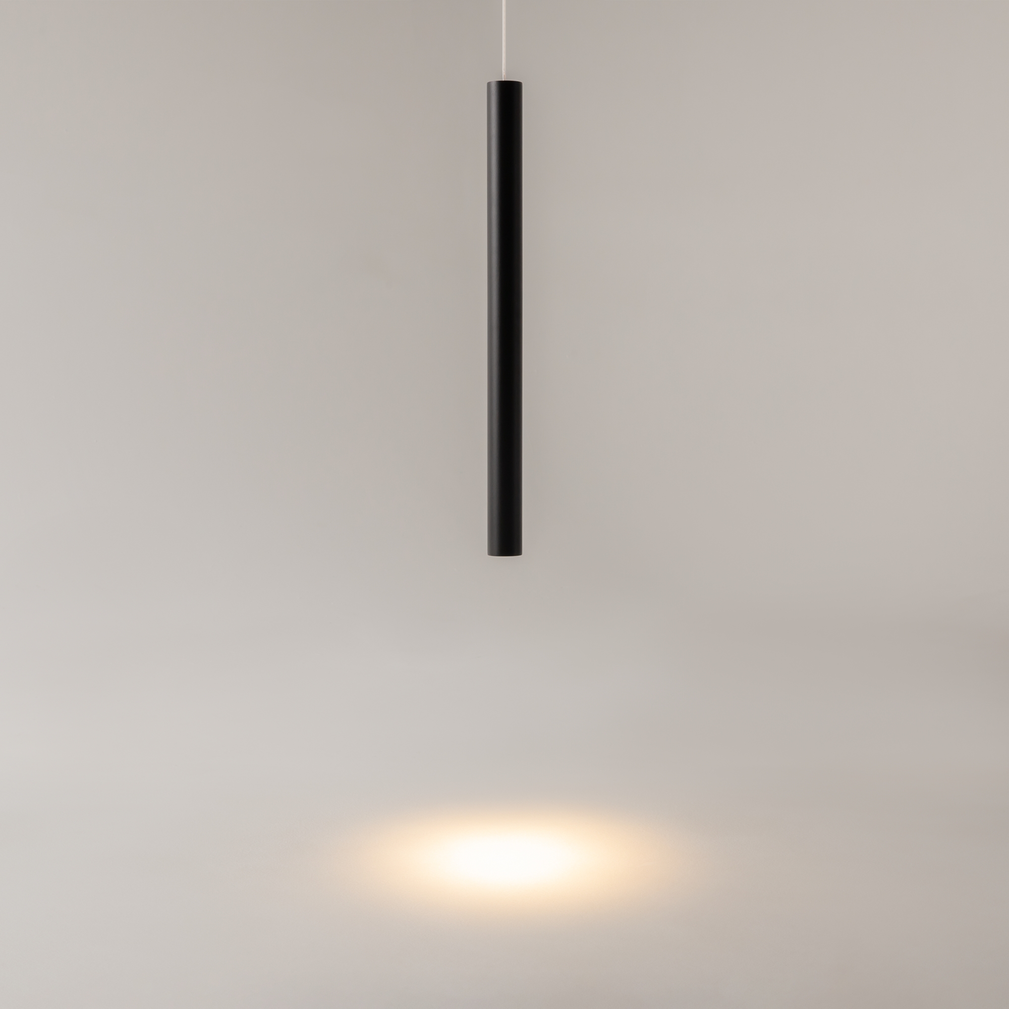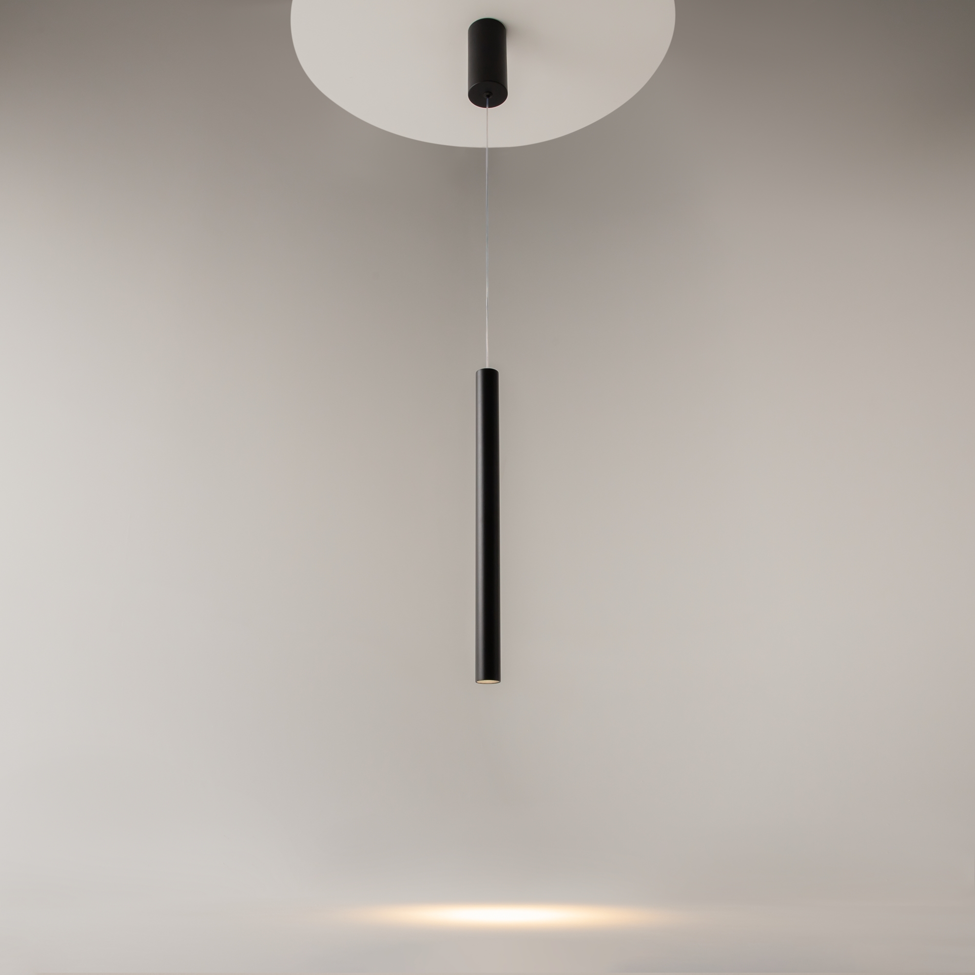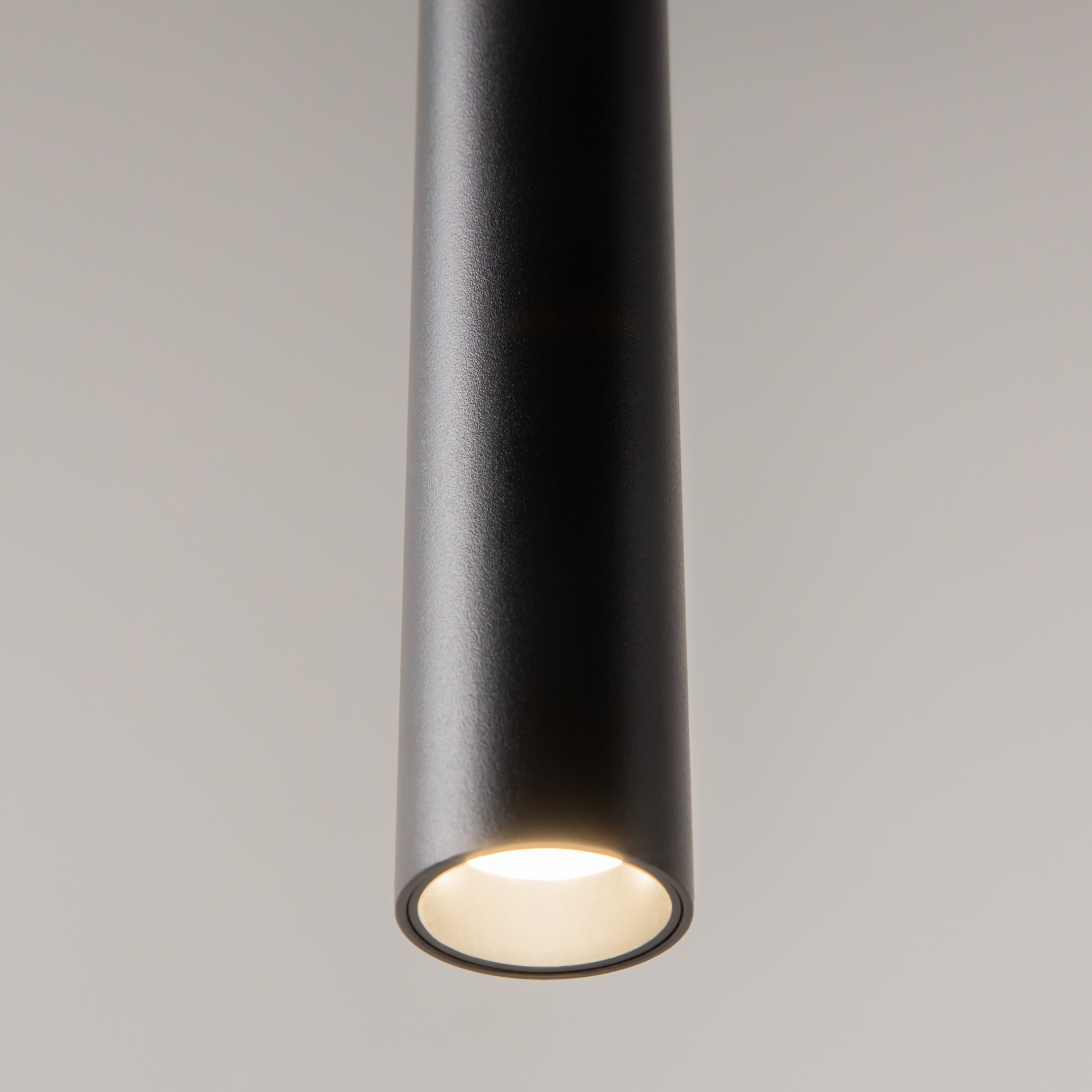 Корпус светильника выполнен из высококачественного алюминия в черном цвете, что придает ему строгий и элегантный вид. Диаметр абажура составляет 30 мм, общая высота конструкции может регулироваться от 620 мм до 3520 мм благодаря подвесной системе монтажа.