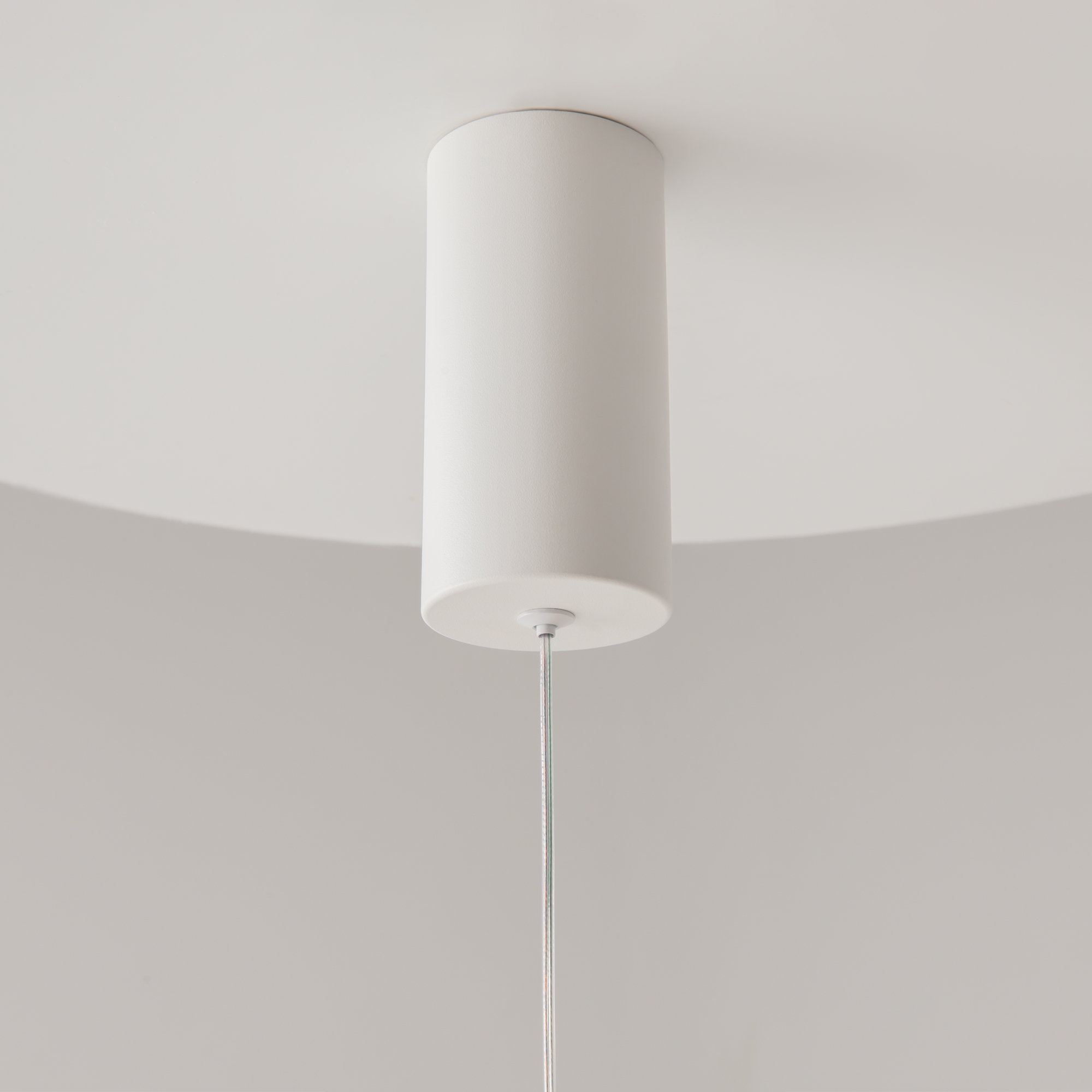 Модель имеет круглую чашу крепления диаметром 6 см и высотой 12 см, что обеспечивает надежную фиксацию светильника к потолку. Общая высота светильника регулируется от 620 мм до 3520 мм, что позволяет адаптировать его под любую высоту потолка и дизайнерские задачи.