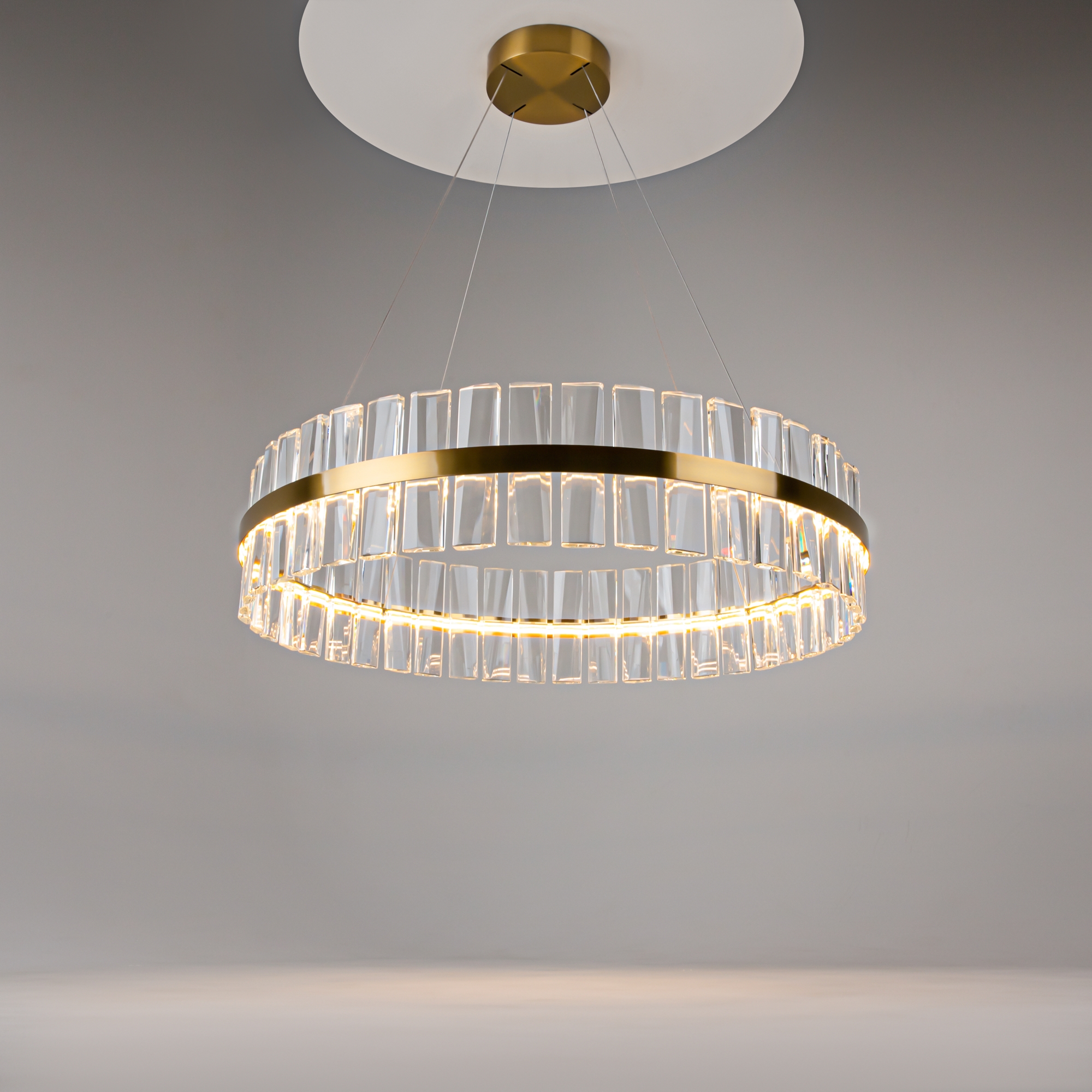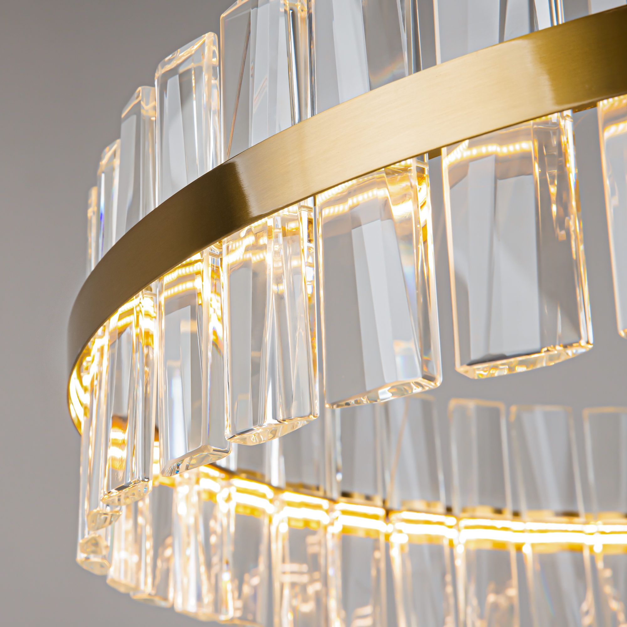 Светильник выполнен в стиле Maytoni Modern, что отражается в его лаконичных линиях и продуманных деталях. Металлическая арматура благородного латунного цвета создаёт эффектный контраст с прозрачными хрустальными элементами абажура. Особенностью данной модели является уникальный декор — объемные прозрачные хрустальные элементы с чередующимся рисунком, которые преломляют свет и создают волшебную игру бликов в интерьере.