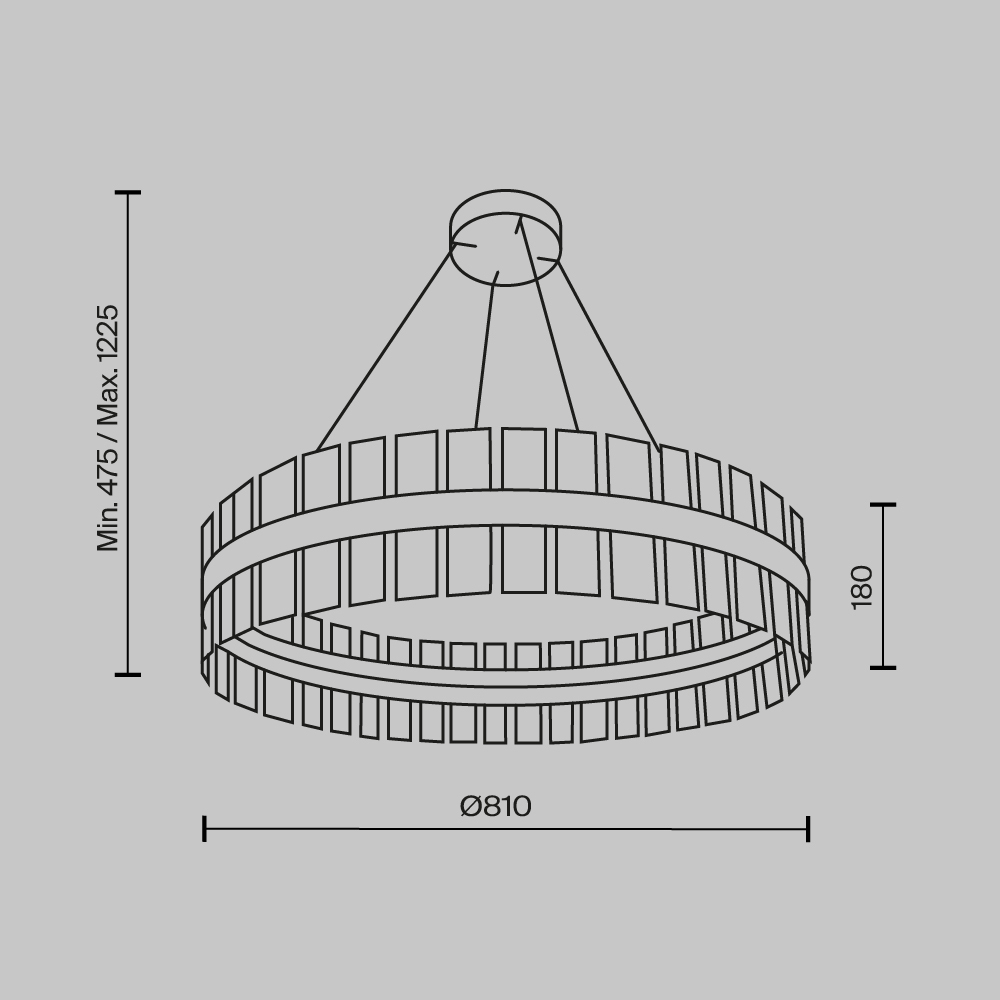 Регулируемая высота — благодаря системе тросов вы можете настроить оптимальную высоту подвеса от 475 до 1225 мм, что позволяет адаптировать светильник под различные интерьерные решения и высоту потолков.
