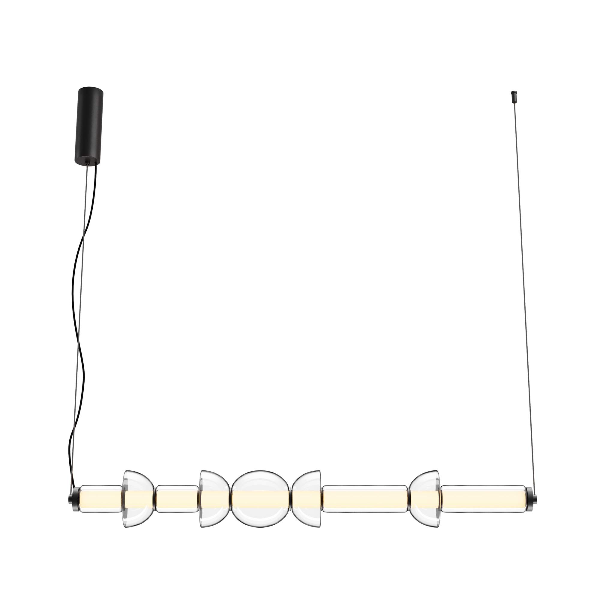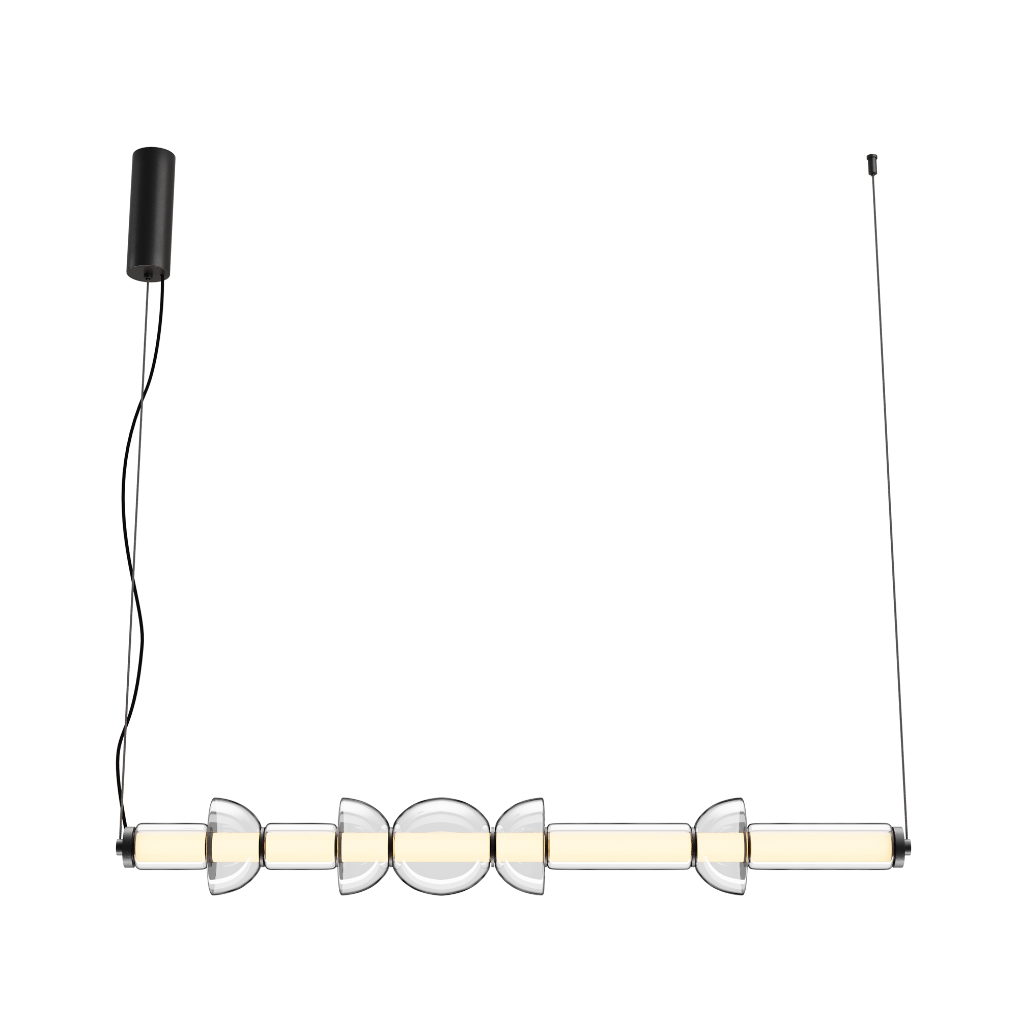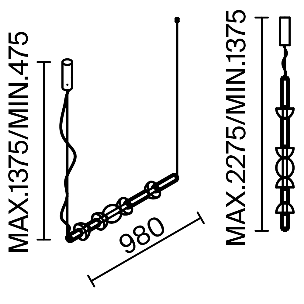 Габариты светильника: длина 980 мм, ширина 160 мм, высота регулируется от 475 мм (минимальная) до 1375 мм (максимальная). Это позволяет адаптировать высоту подвеса к особенностям помещения.