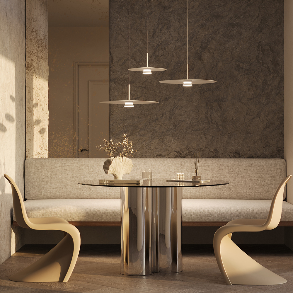 Серия Platte отличается элегантными плоскими формами и рассеянным типом освещения, что создает мягкий, комфортный свет без резких теней. Длинный регулируемый провод (до 3 метров) позволяет использовать светильник в помещениях с разной высотой потолков и реализовывать различные дизайнерские идеи.