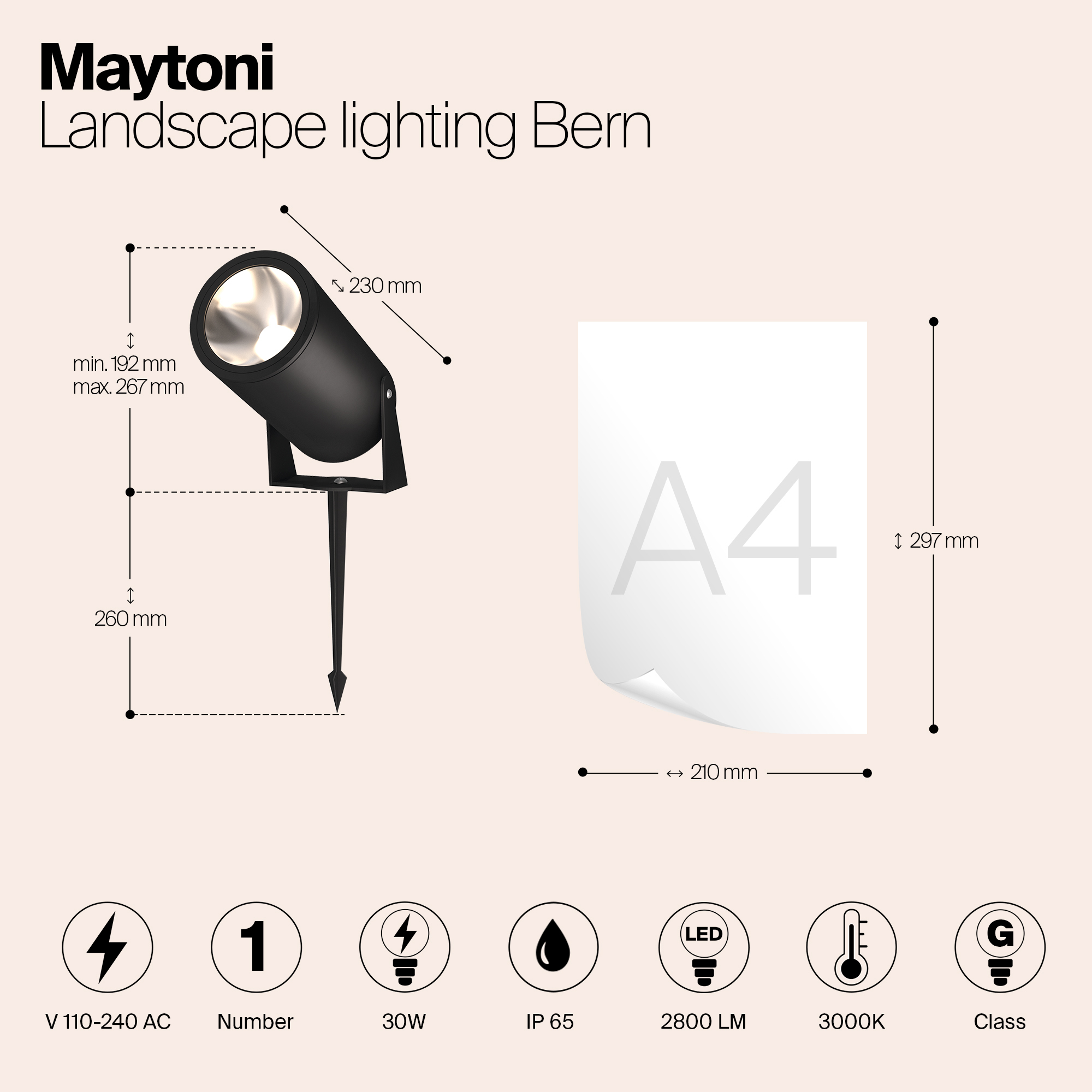 Светильник Bern оснащен встроенным LED-источником света мощностью 30 Вт. Светодиодная технология обеспечивает высокую энергоэффективность и долгий срок службы светильника. Прибор генерирует световой поток 2800 люмен с углом рассеивания 50 градусов, что позволяет создать комфортное, равномерное освещение нужной зоны.