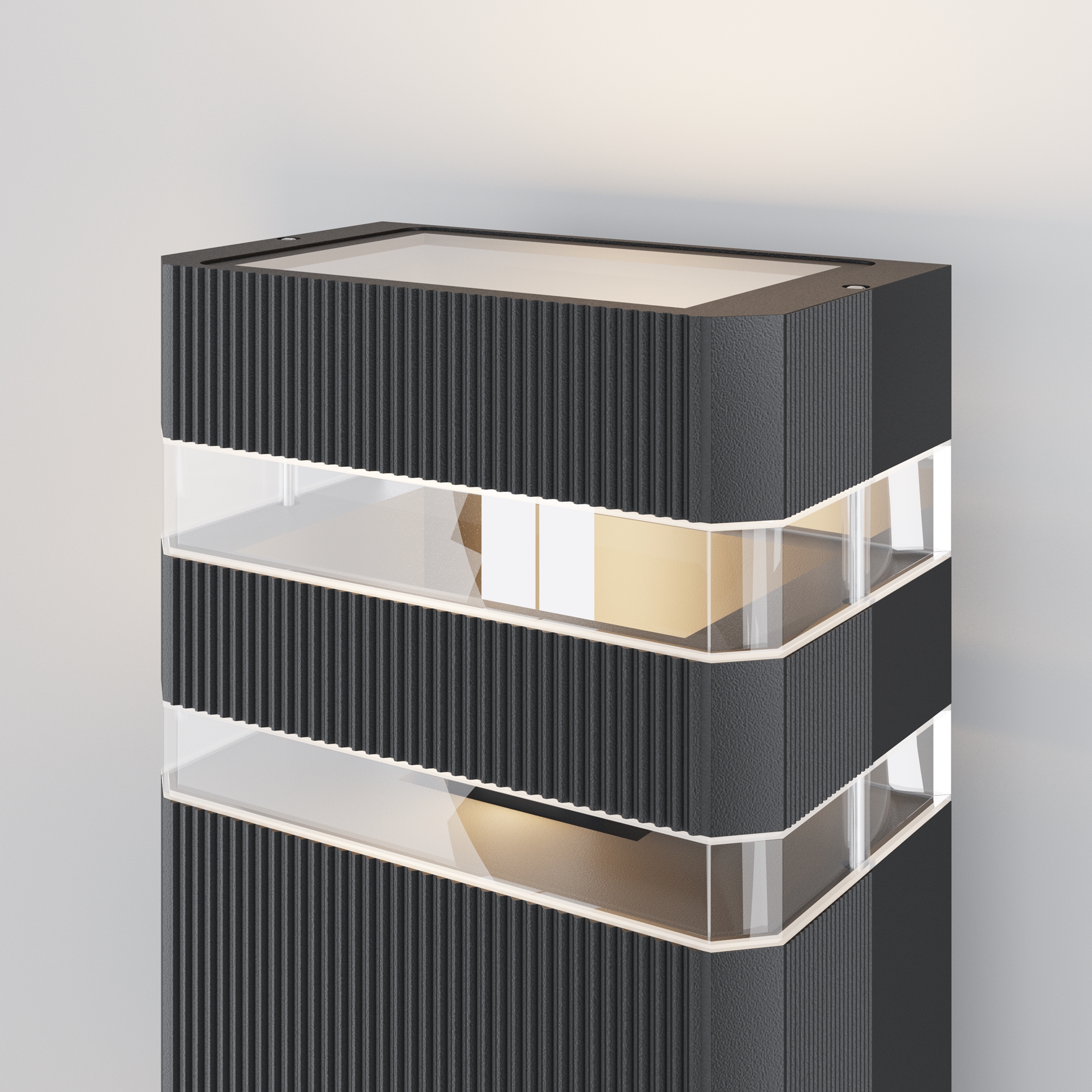 Садово-парковый светильник Outdoor O578WL-02B отличается рифленой поверхностью корпуса и компактными прозрачными рассеивателями из пластика, которые гармонично вписываются в общую концепцию дизайна. Черный цвет алюминиевого корпуса придает модели строгость и универсальность, позволяя органично дополнить любой экстерьер — от классического до современного.
