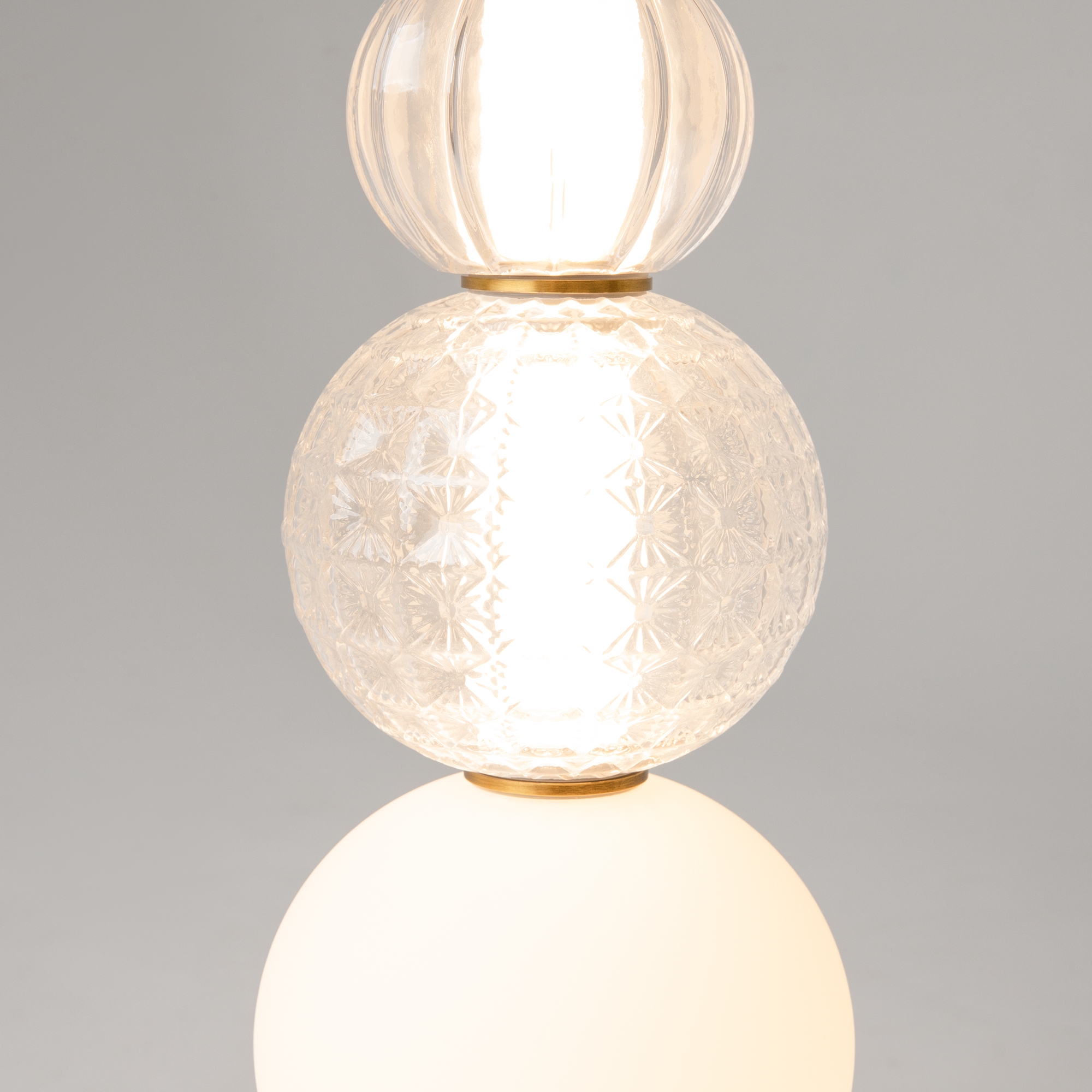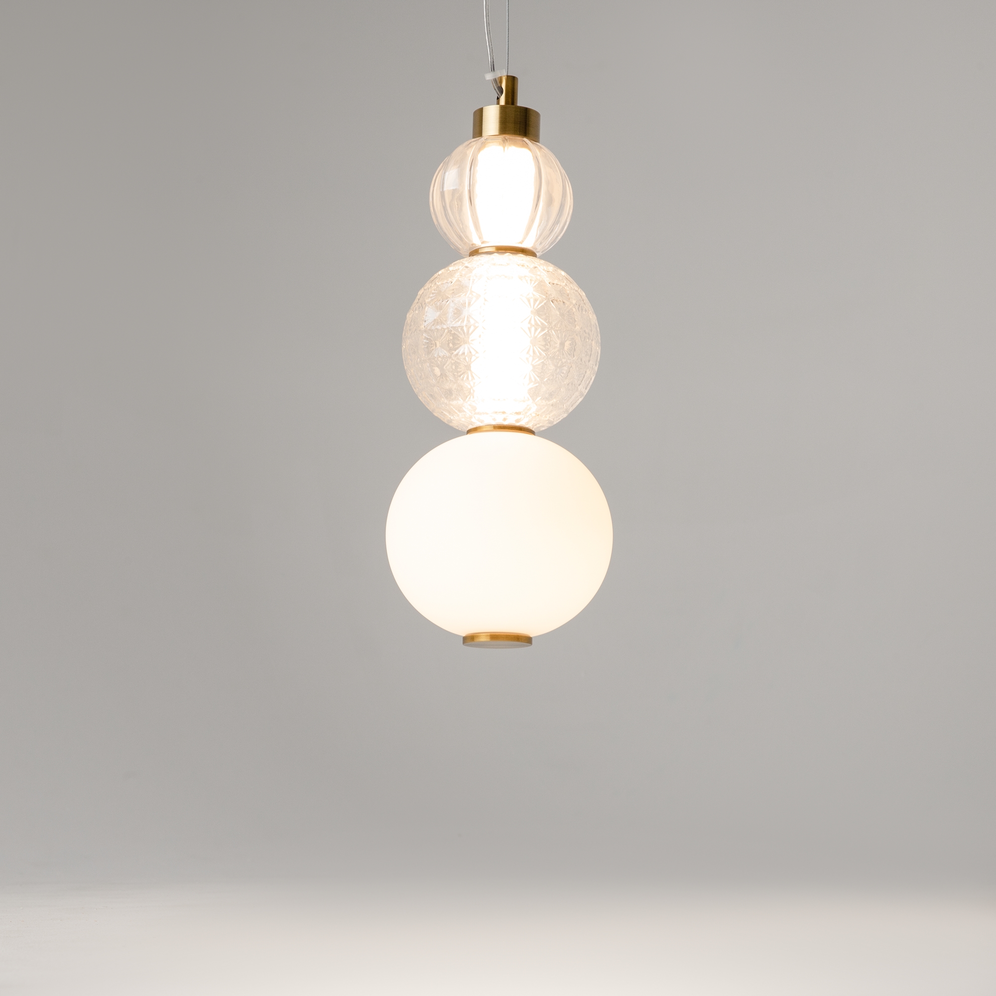 Светильник Collar представляет собой изящную сферу из выдувного стекла, нанизанную на прочный трос. Оригинальное сочетание прозрачного и белого стекла с металлическими элементами золотого цвета создает неповторимый эффект игры света. Диаметр основной части светильника составляет 147 мм, что делает его компактным, но заметным элементом интерьера.