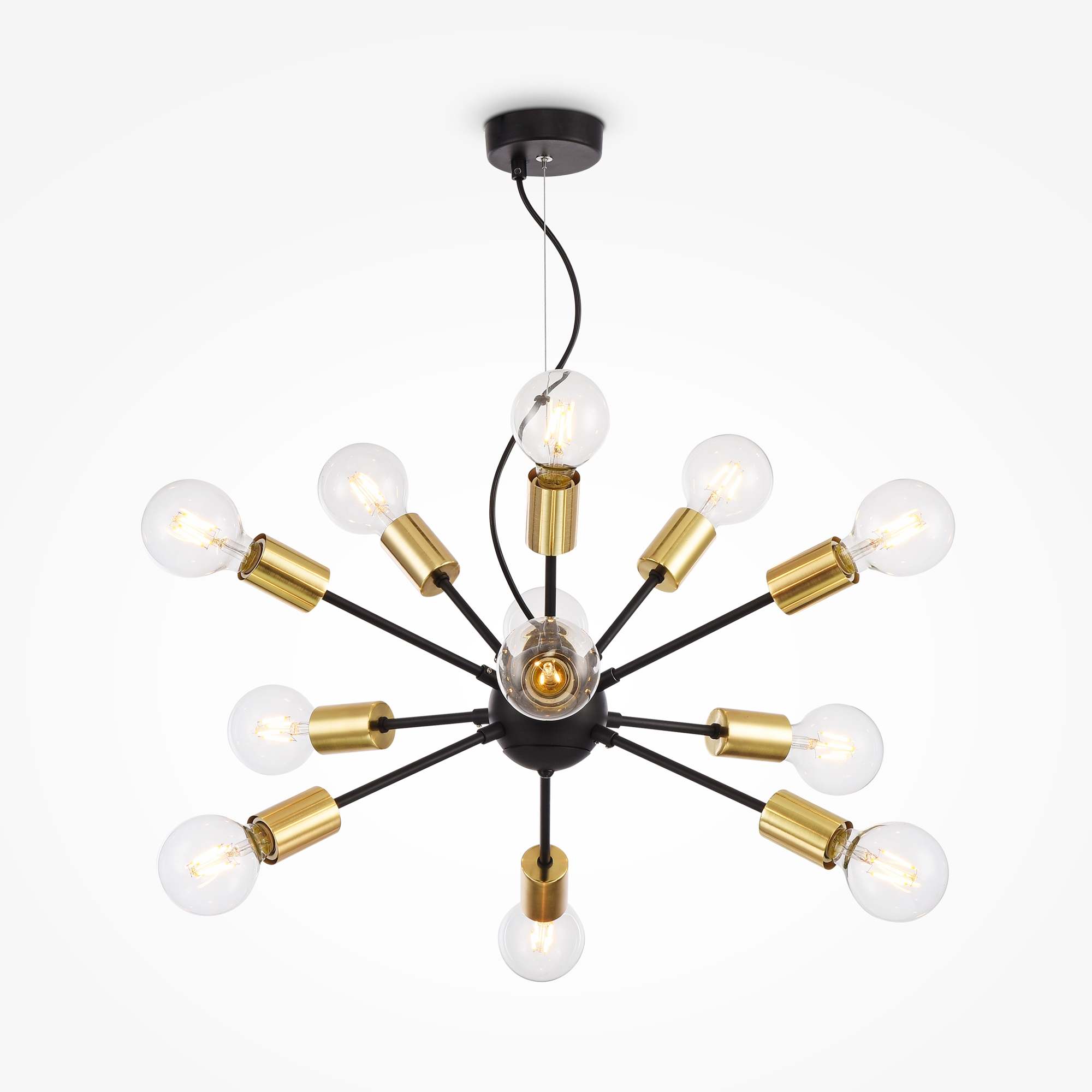 Подвесной светильник выполнен в индустриальном стиле, что делает его идеальным решением для современных интерьеров в стиле лофт. Металлическая арматура окрашена в насыщенный чёрный цвет, создающий эффектный контраст с декоративными колпачками теплого латунного оттенка. Диаметр светильника составляет 750 мм, а максимальная высота – 1562 мм, что позволяет организовать эффективное освещение даже в просторных помещениях.