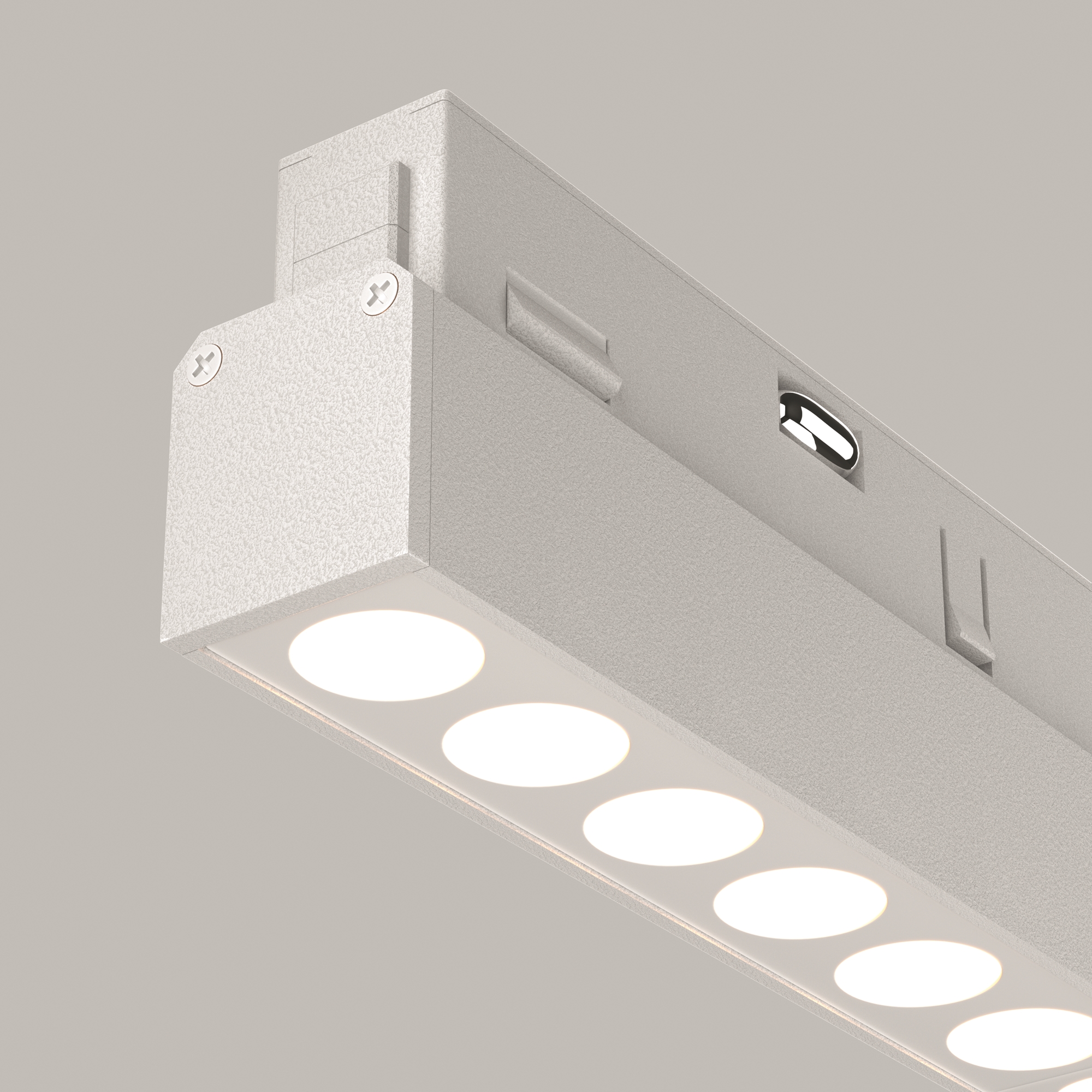 Корпус светильника выполнен из прочного алюминия белого цвета, что придает ему легкость (всего 0,16 кг) и долговечность. Компактные размеры (длина 220 мм, ширина 22 мм, высота 44 мм) позволяют использовать светильник в помещениях с любой высотой потолков, не перегружая пространство визуально.