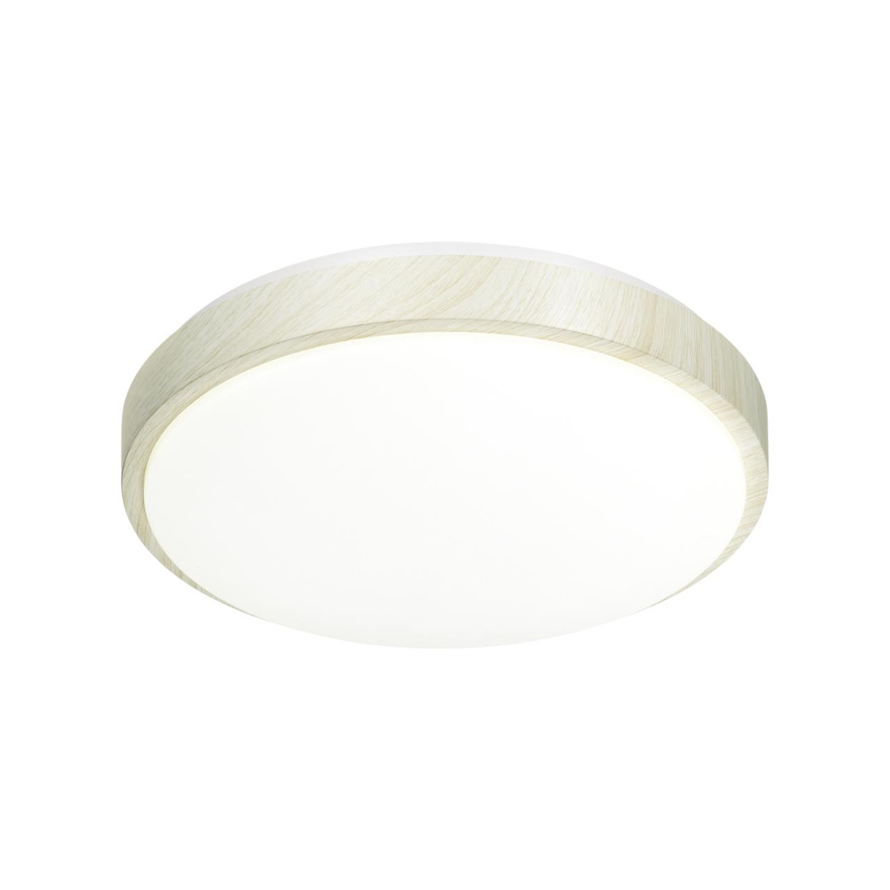 Светильник состоит из металлического основания белого цвета с глянцевой поверхностью и круглого пластикового рассеивателя. Особую изысканность модели придаёт декоративный обод из пластика под беленое дерево, который эффектно обрамляет плафон. Рассеиватель изготовлен из высококачественного пластика марки PMMA 2.0 с матовой поверхностью, обеспечивающего равномерное распределение света и отличное светопропускание.