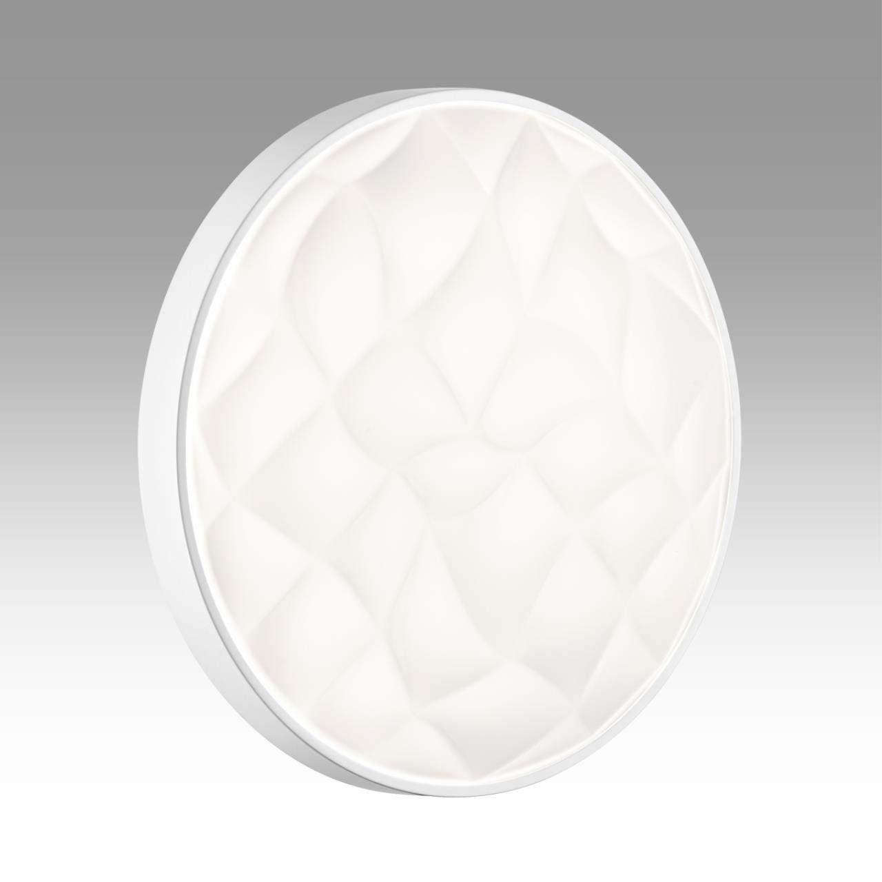 Особенность модели — рассеиватель из высококачественного пластика PMMA 2.0 белого цвета с матовой поверхностью, который декорирован изящной рельефной структурой и ободом из белого пластика. Такое исполнение обеспечивает равномерное рассеивание света и отличное светопропускание, создавая мягкое, комфортное освещение без резких теней.