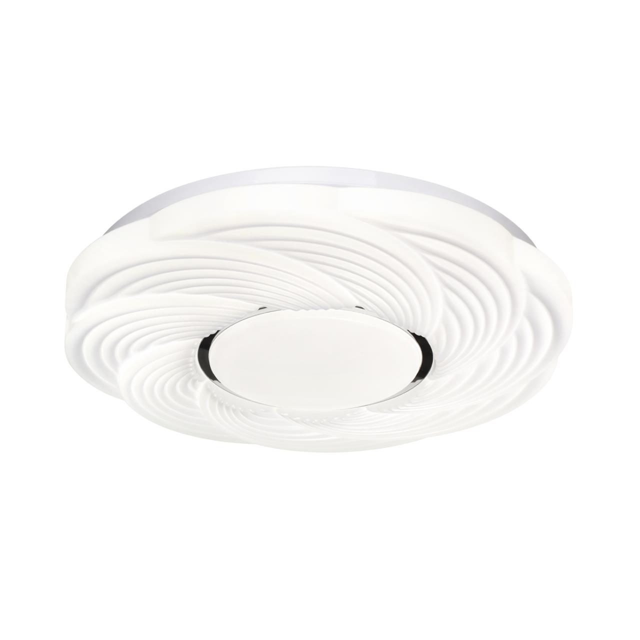Светильник имеет круглую форму с диаметром 390 мм и высотой всего 75 мм, что делает его идеальным для помещений с невысокими потолками. Основа выполнена из прочного металла белого цвета с глянцевой поверхностью, обеспечивающей долговечность конструкции. Плафон изготовлен из высококачественного пластика марки PMMA 2.0 с матовой поверхностью и оригинальной рельефной структурой, что придает светильнику изысканный внешний вид.