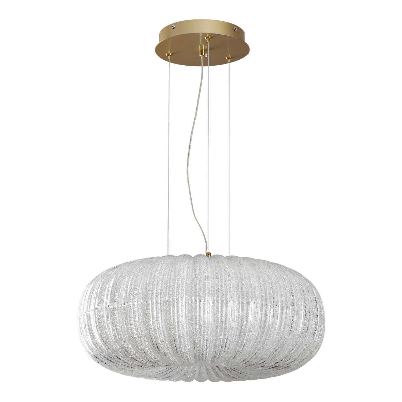 Плафон светильника выполнен из премиального акрила, который полностью имитирует чистое прозрачное стекло, но при этом обладает меньшим весом и повышенной прочностью. Внутренняя часть плафона декорирована стеклянной крошкой, создающей потрясающий эффект искрящегося и переливающегося света. Золотистая арматура из металла с глянцевой крашеной поверхностью гармонично дополняет прозрачный плафон, придавая светильнику особую роскошь.